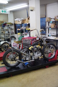これはアメリカでは珍しい?と思うんですが、日本人好みなオールドスクールチョッパー。エンジンはエボを搭載しています。