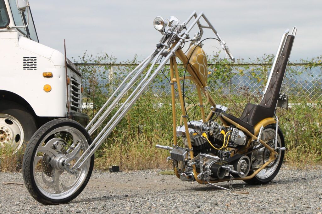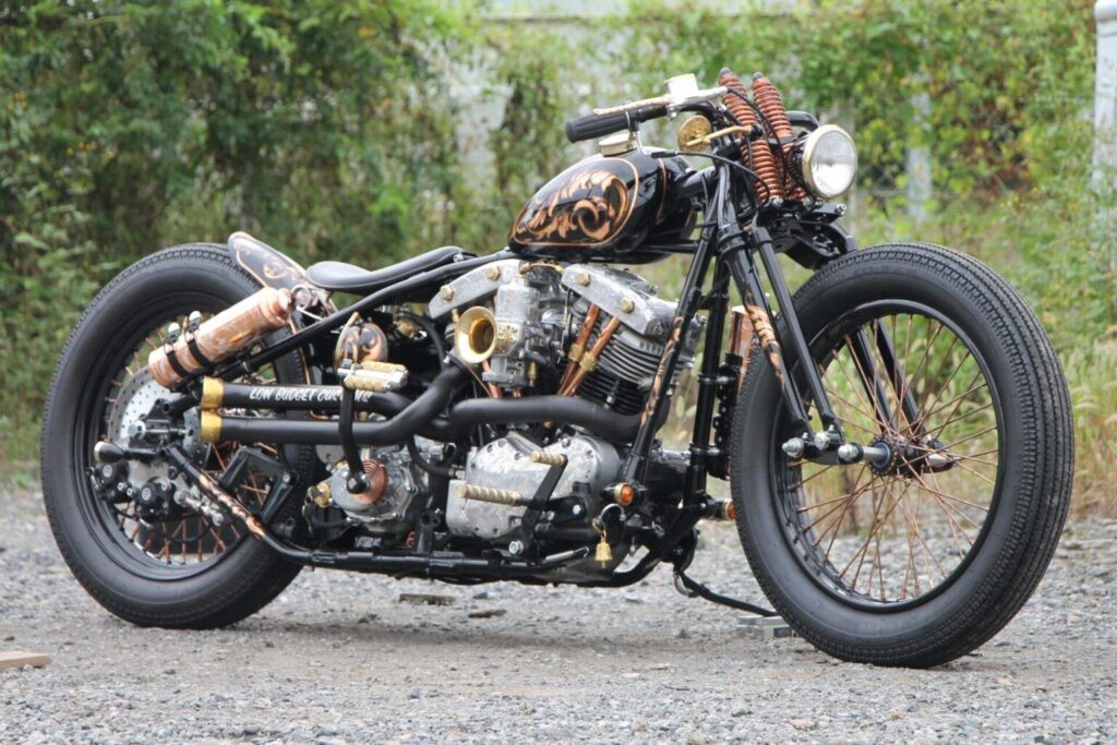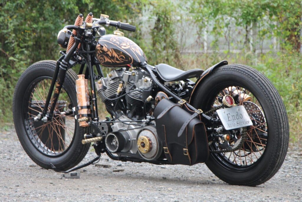この車両は、過去にホットロッドカスタムショーやジョインツにも展示させていただいたことがあるモデルで、銅メッキをベースに、黒とのコントラストが際立つデザインが特徴です。さらに、全身に施されたエングレービングによって、高級感がグッと増しています。ハーレーというと、重厚で迫力のあるイメージを持たれる方も多いかと思いますが、このモデルは非常に軽快な乗り味で、道を選ばず気軽に楽しめるスタイルに仕上がっています。