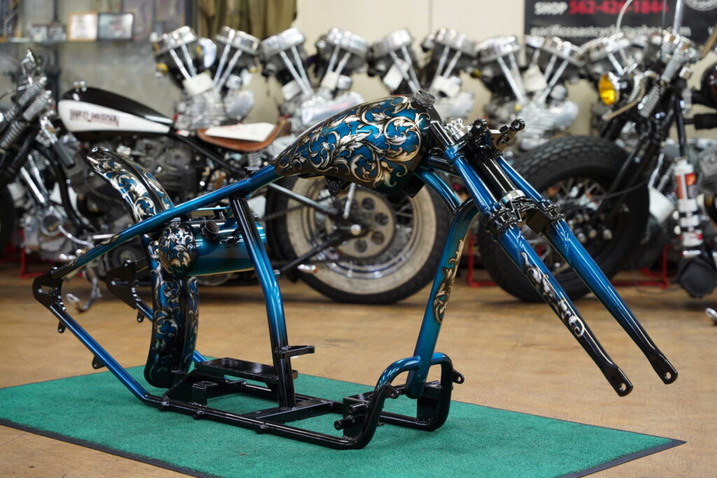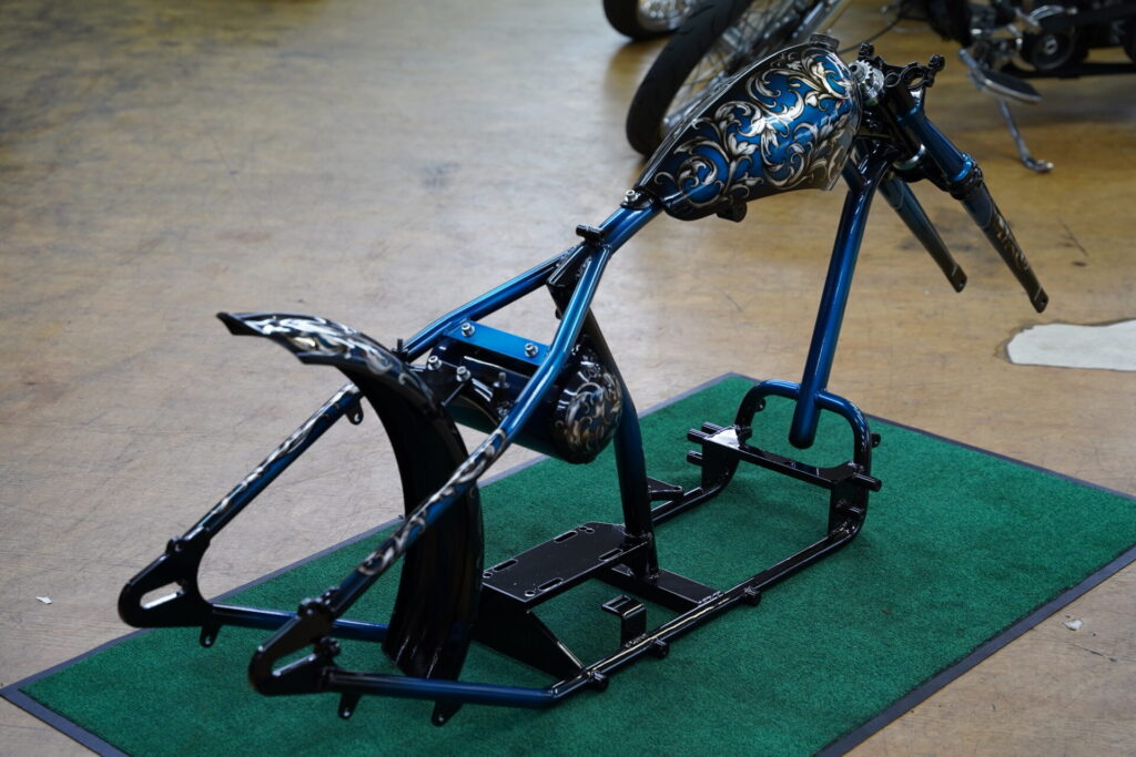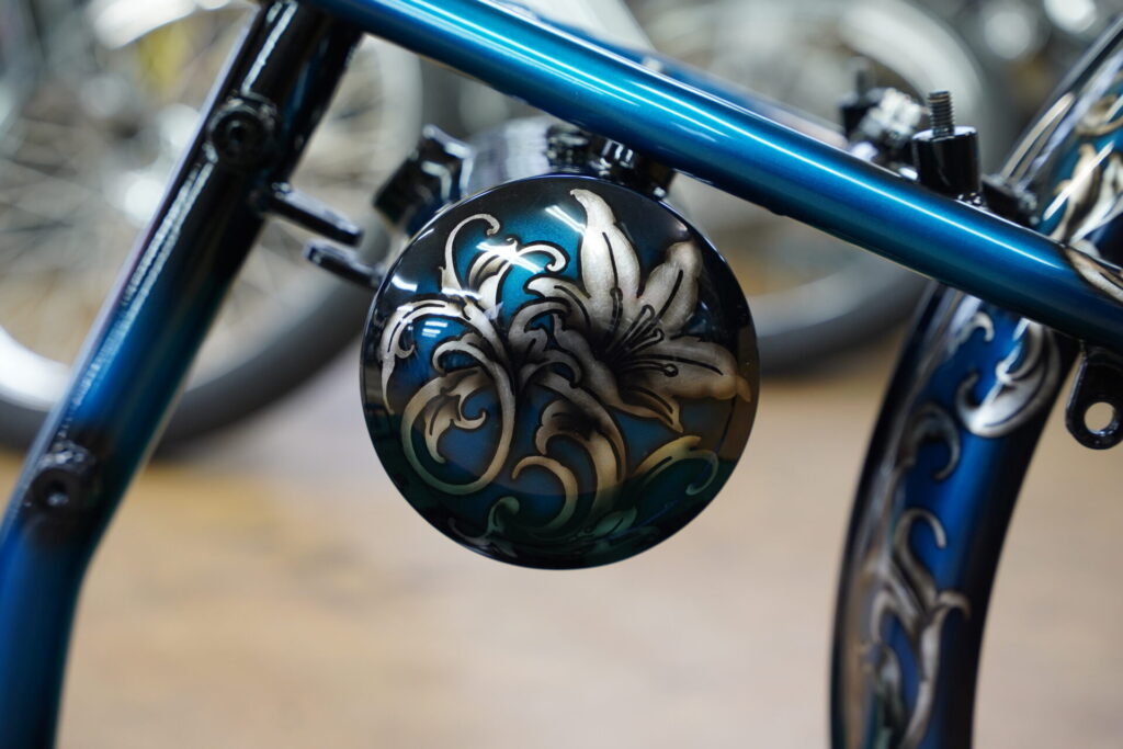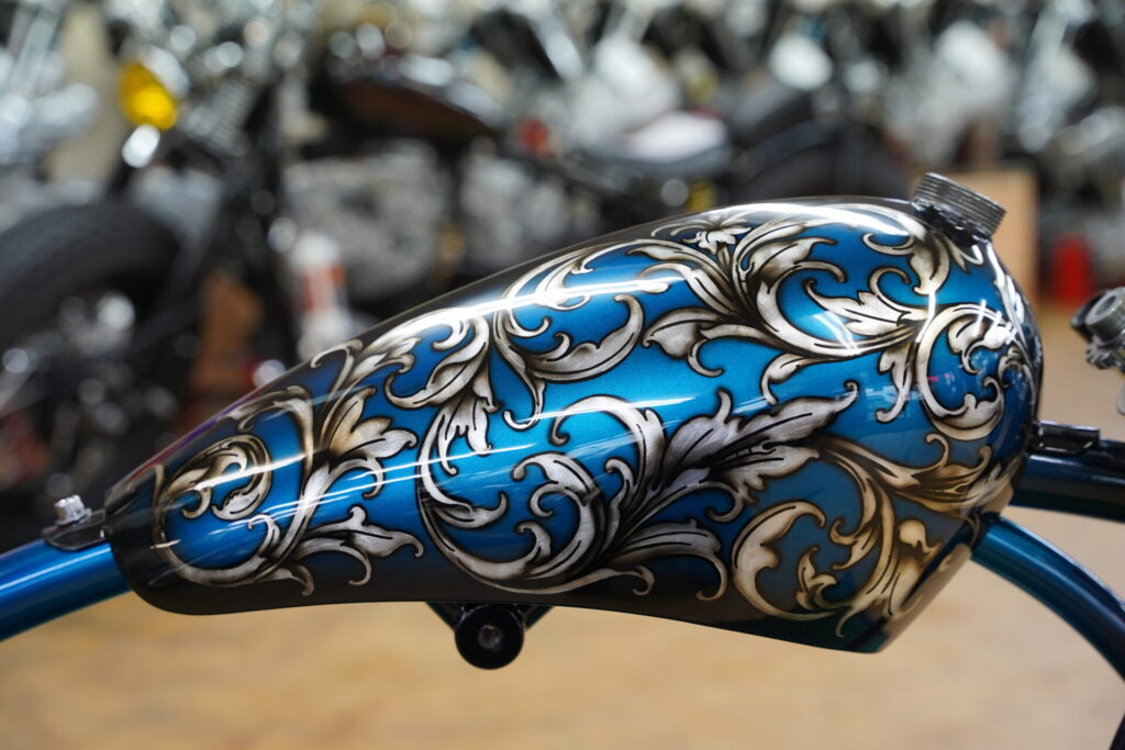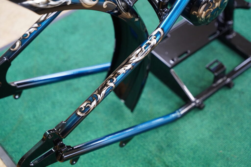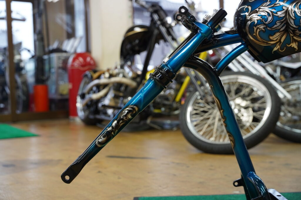 しかもこの唐草柄、タンクやフェンダーといった外装パーツだけではなく、リジットフレームやスプリンガーフォークにもペイントを施しています!こうすることで、車体全体が一つのテーマでまとまり、後付けカスタムではない「完成された世界観」を感じさせてくれるんです。