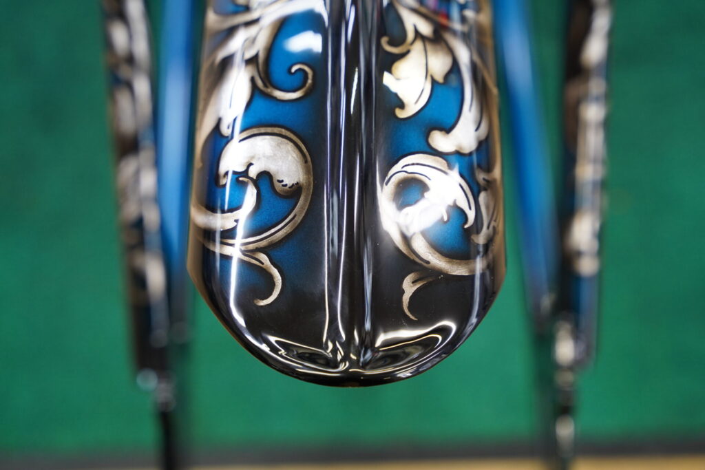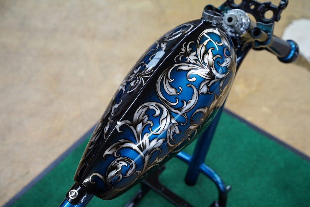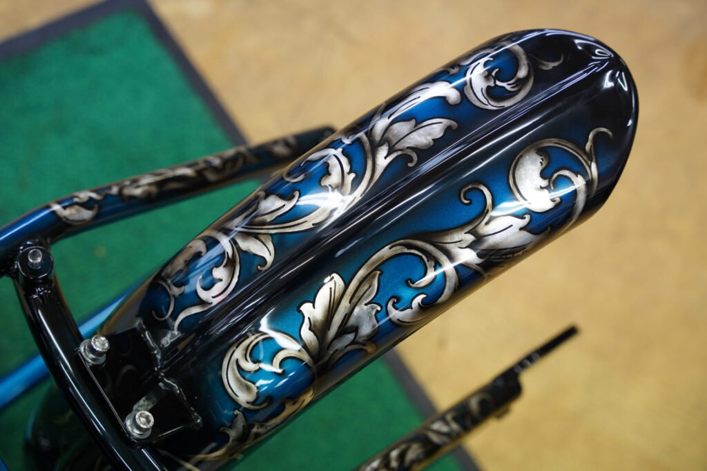 このプロジェクト、スタート当初から「今までとはまたちがった一台に仕上げよう!」という想いがありまして、そのイメージを現実のものにしてくれたのが、我らが信頼するカスタムペインター・Gクラシック赤坂氏です!デザインは赤坂氏にホボ丸投げとなっていますが、オオガキにとっても好みな仕上がりとなりました。