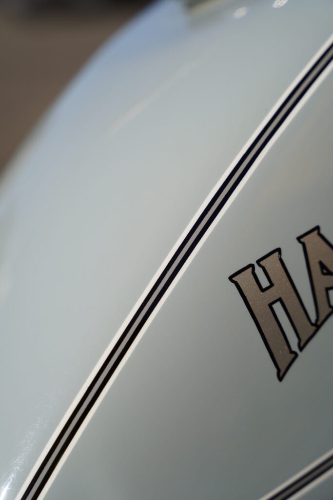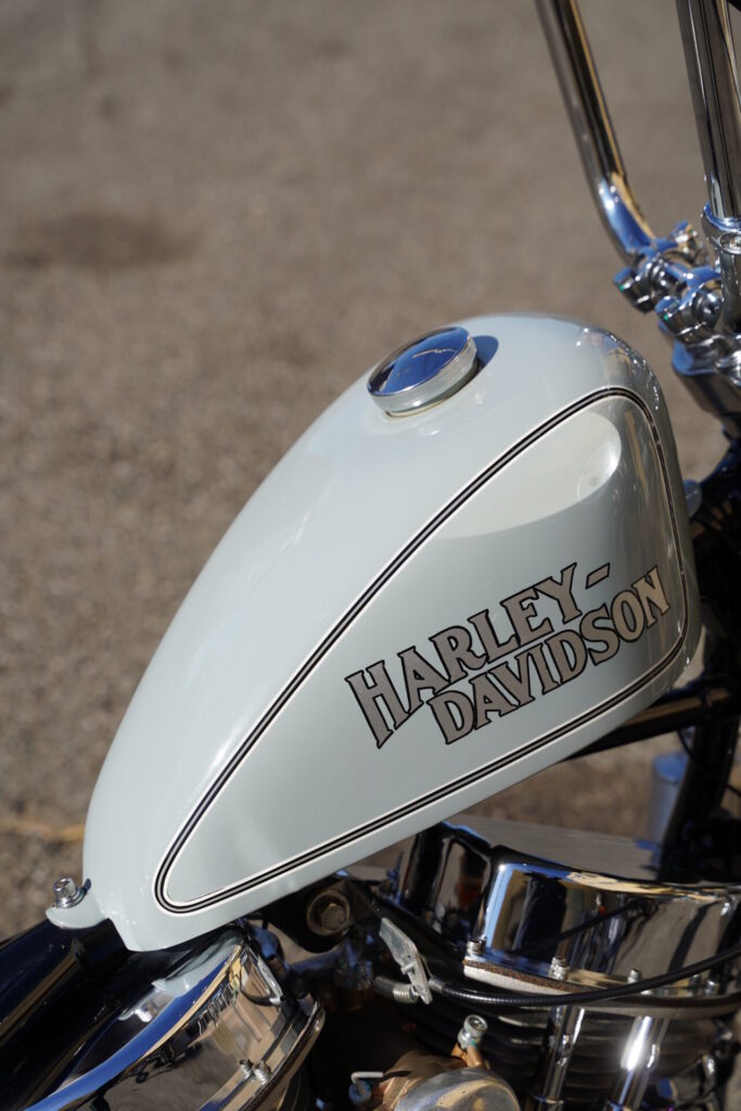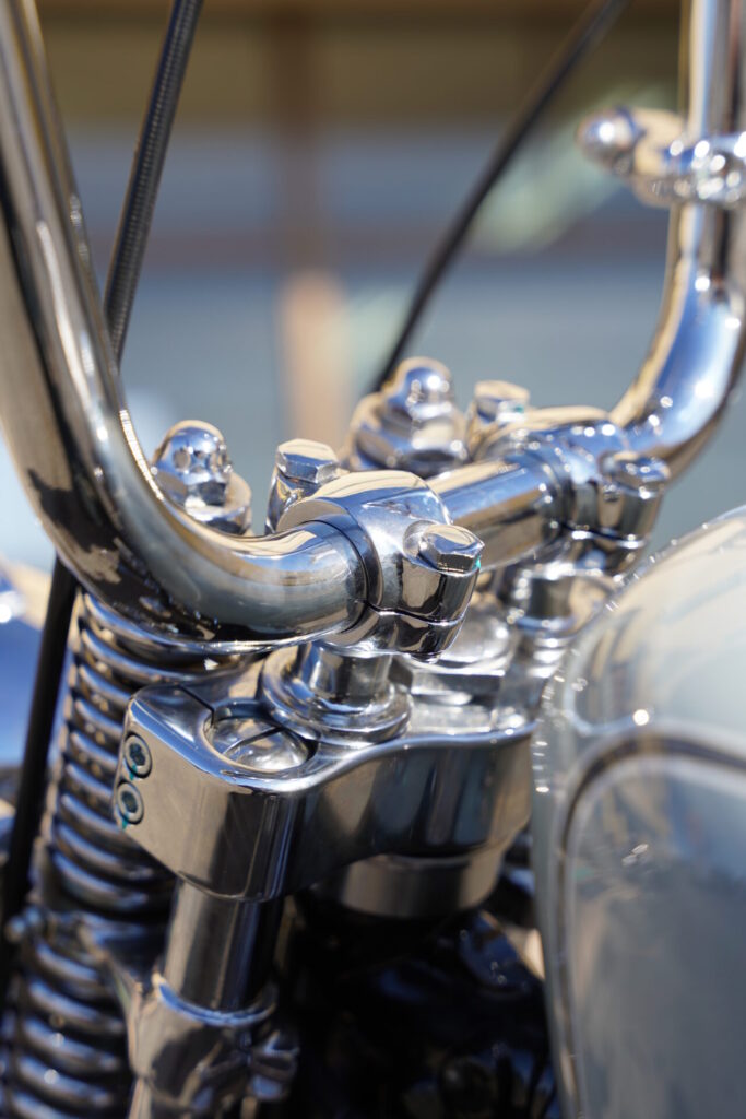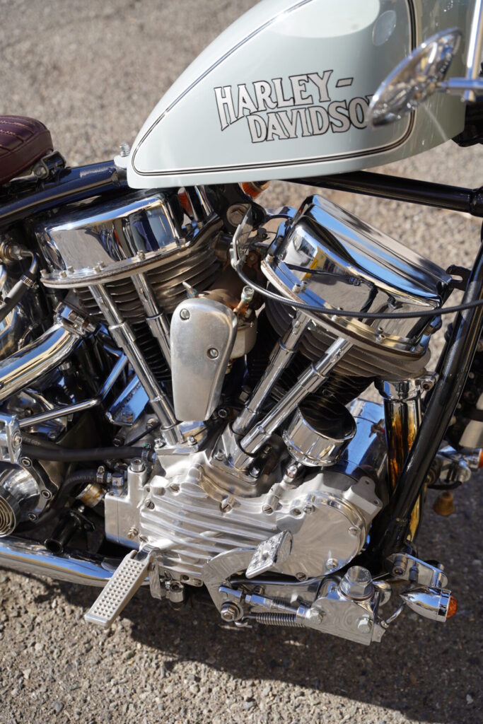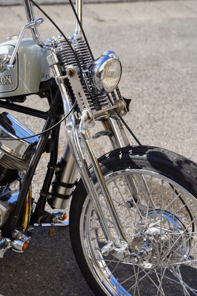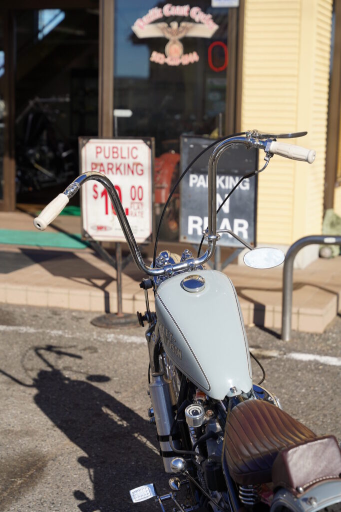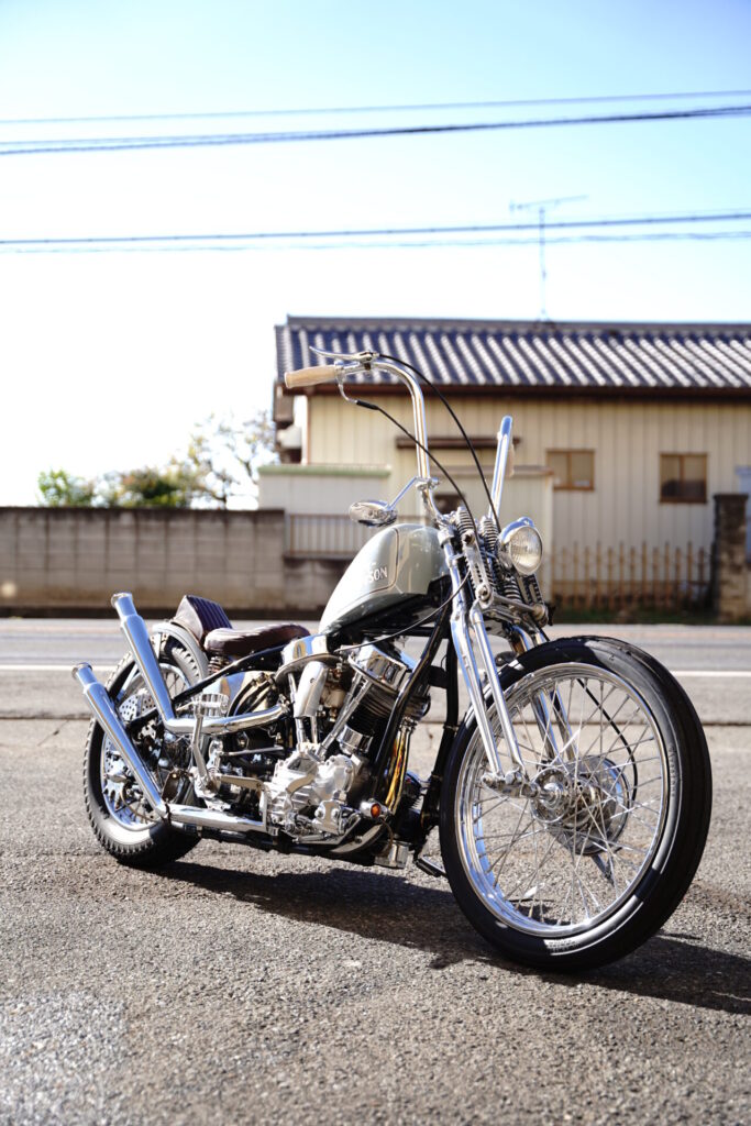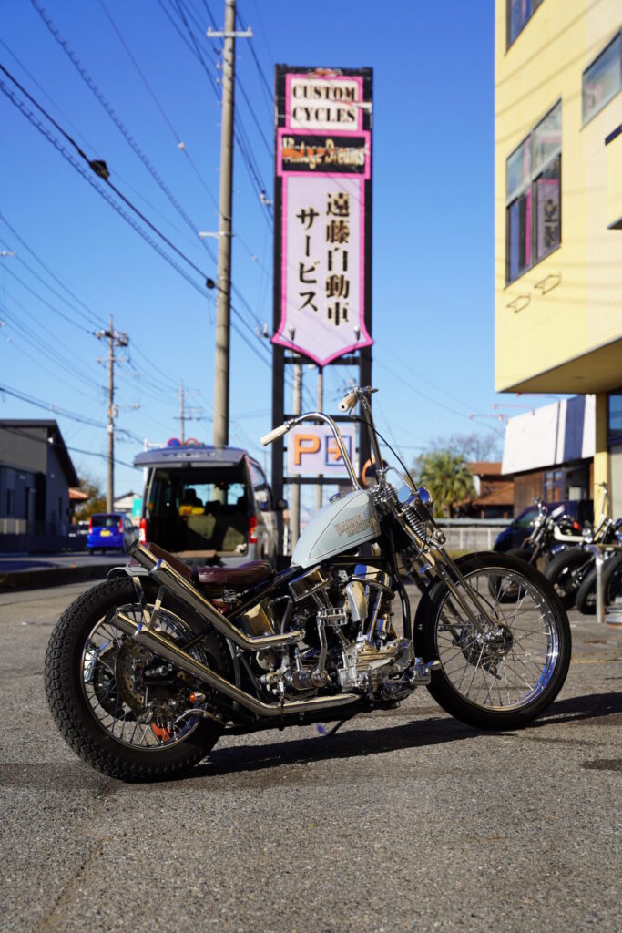こんばんわオオガキです!明日は、東京のオーナー様宅へチョッパーをお届けに行く予定なのですが、本日積込させていただく前にちょっと撮らせて頂きましたのでご紹介いたします。 当店にて御預かりしている間にも結構多くの「いいね!」を頂けるチョッパー様なのですが、この度は大きめなエイプハンガーを製作させて頂きまして交換となりました。高さは約40㎝となりましたが、オーナー様が座って肩の高さよりも少し高いくらいの位置にコブシがあるようなイメージに作らせて頂きました。。 パンヘッドエンジンは、いつもピカピカに維持されています。 タンクのカラーは鮮やかなグレーでシンプルが、とてもカッコイイです。 シンプルと言っても、ラインには3色を使って5本の細いラインを描いているので簡単なデザインとは言えません。 VLスプリンガーのレプリカウォークは、キャシャでカッコいいです。 スポーツスタータンクとエイプハンガーハンドルがとても似合います。 フランダースstyleのライザーはヴィンテージチョッパーには間違いなく似合います。 ミッドフットコントロールがとても楽ちんでイイ感じです。乗りやすさを優先したい方にもオススメ。 リンカートキャブレターは新品で購入したもの。とても調子が良くて今のところ不具合なく元気です。 気軽に乗れちゃうカッコい~チョッパーなんてとてもイイです♪ BLOG この記事が気に入ったら いいね または フォローしてね! Follow @ENDOAUTOSERVICE Follow Me よかったらシェアしてね 2026年の「コヨーテミーティング」は5月と9月に開催します♪ 関連記事 2026年の「コヨーテミーティング」は5月と9月に開催します♪ 2025年11月21日 銅&真鍮のキックペダルを製作中〜♪ 2025年11月20日 コンセントがなくても使える充電器♪ 2025年11月19日 新作の販売車両「ショベルリジットチョッパー」のご紹介♪ 2025年11月16日 10年以上前に廃盤…懐かしいチェンシンのTT100レプリカタイヤ 2025年11月16日 74スプリンガーのブレーキトルクロッドの角度を調整~♪ 2025年11月14日 先週のお休みに「ホンダコレクションホール」へ行ってきました♪ 2025年11月13日 レーシーなチョッパー!ついに初乗りの日♪ 2025年11月12日