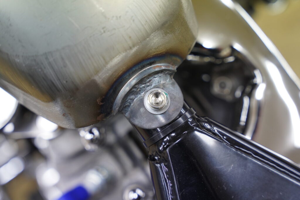適切なグリスを塗布して組み上げ動きがスムーズになるよう、リンク部分の抵抗を確認しながら調整していきます。見た目はコンパクトでシンプルなフォークですが、こういった細かなメンテナンスをしてこそ“味のあるチョッパー”として末永く乗っていただけると思います。