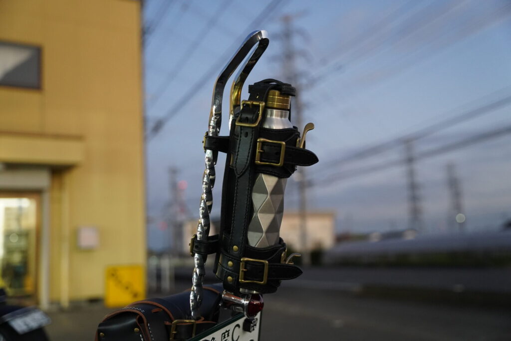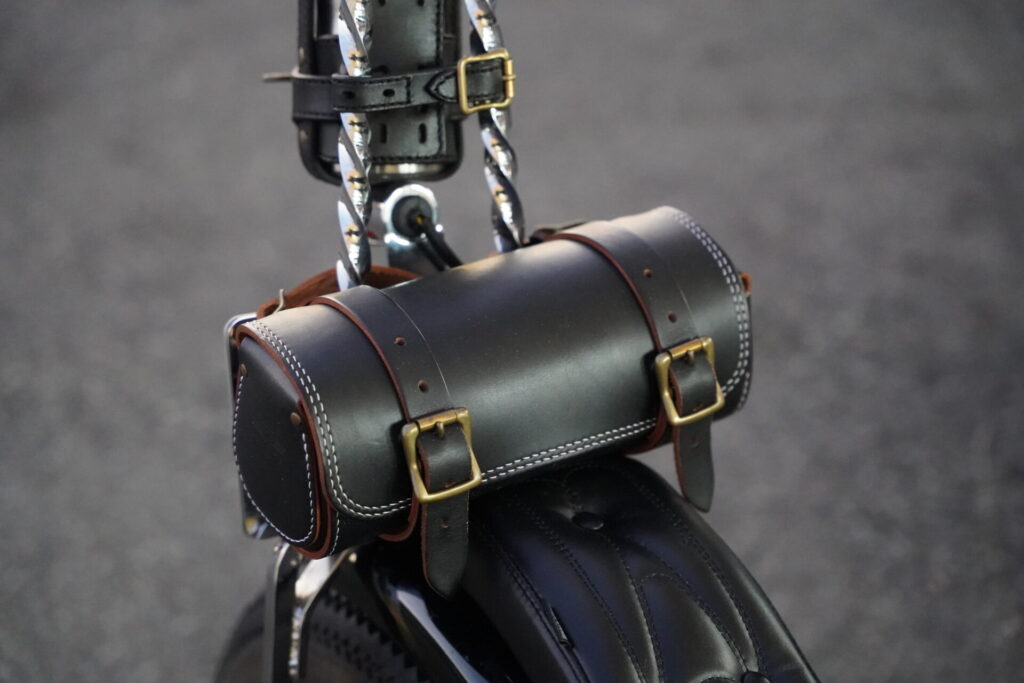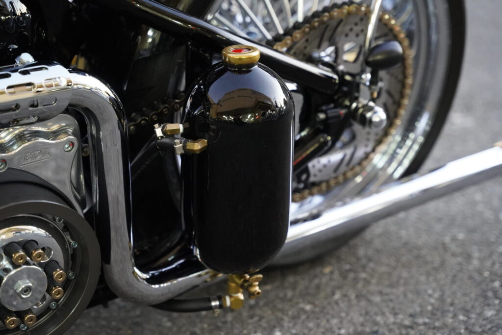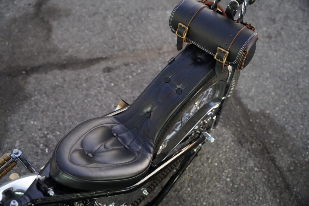 フロントはナロースプリンガーに21インチと、かなりナローなチョッパーStyleですが、利便性も高めるため後輪にダブルキャリパーをセットし制動力はしっかりキープ。気軽に乗り出せるようセルスターターも使用可能にし、街中でもスイスイ乗って楽しめる理想的な仕様となっております。