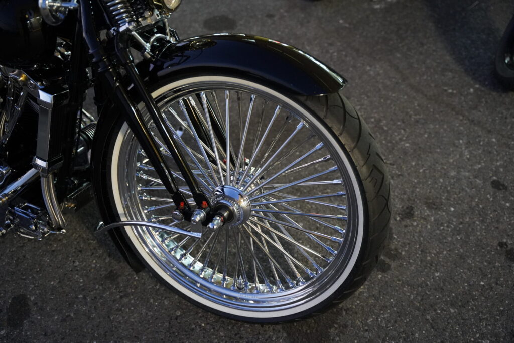 ワイドなタイヤをセットアップしておりますが、もちろんのことフレームが標準的な物ではできることではありません。そこから特別な仕様になっていますので、他に類を見れることは少ないです。あちこちにオーナー様のコダワリが詰まっているSPECIALな1台となっております。