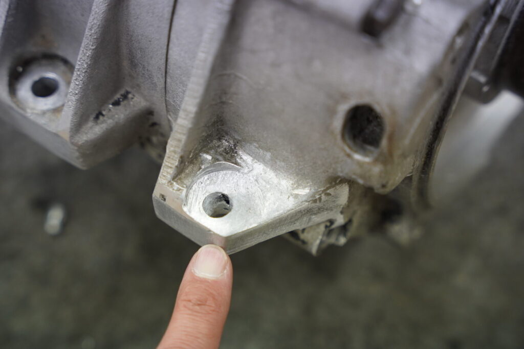 エンジンとフレームを固定する大切な部分である エンジンマウント部 も、損傷しているケースが非常に多く、今回も例外ではありませんでした。割れを溶接修理し、寸法を整えなおして再度穴あけ加工を行いました。