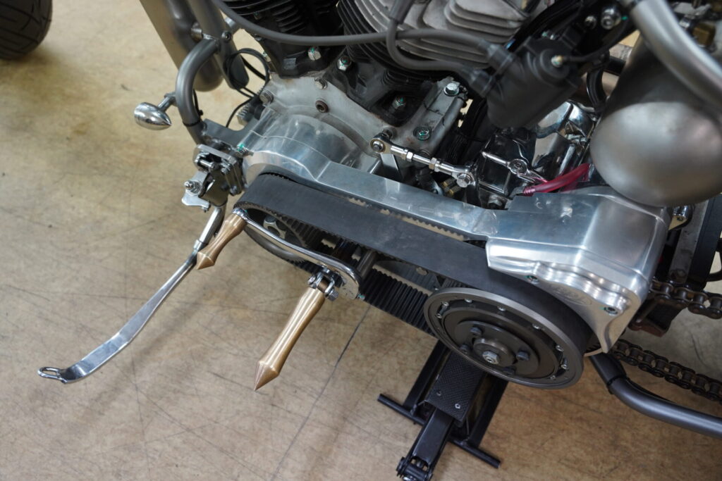ミッションを分解し始めると、キックペダルシャフトが収まる ケース部分にひび割れ を確認しました。これもショベル年代ではよくあるトラブルで、溶接修理を施す場合もあれば、カバーごと新品交換 という選択肢になることもあります。