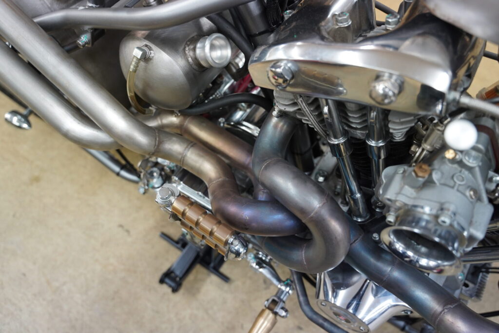 シリンダーヘッドのマフラー取付部は、ショベルヘッド最大の弱点とも言える部分 です。3台に1台は修理しているのでは?と感じるほど、割れや変形が日常的に発見される場所で、今回もやはり修正が必要な状態でした。