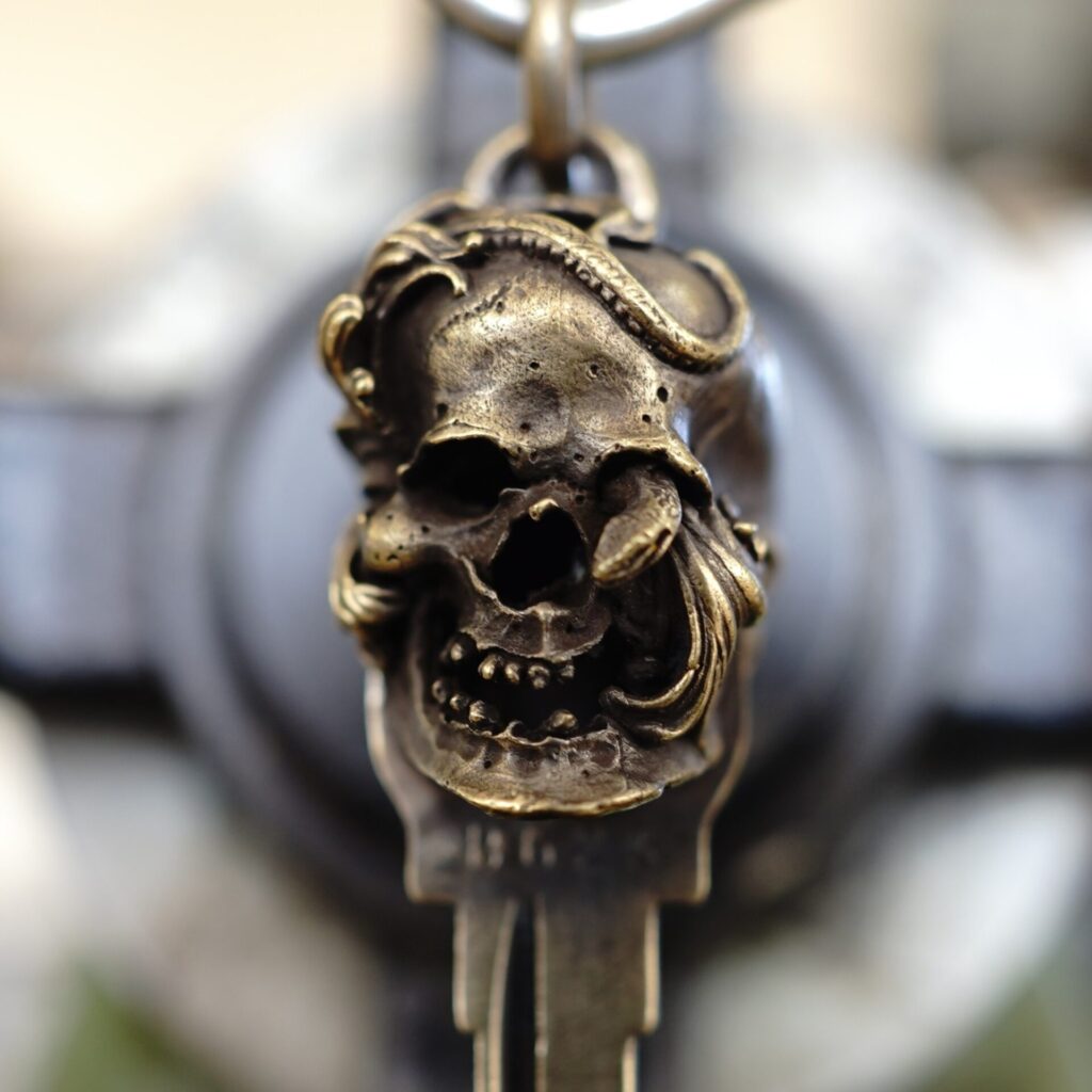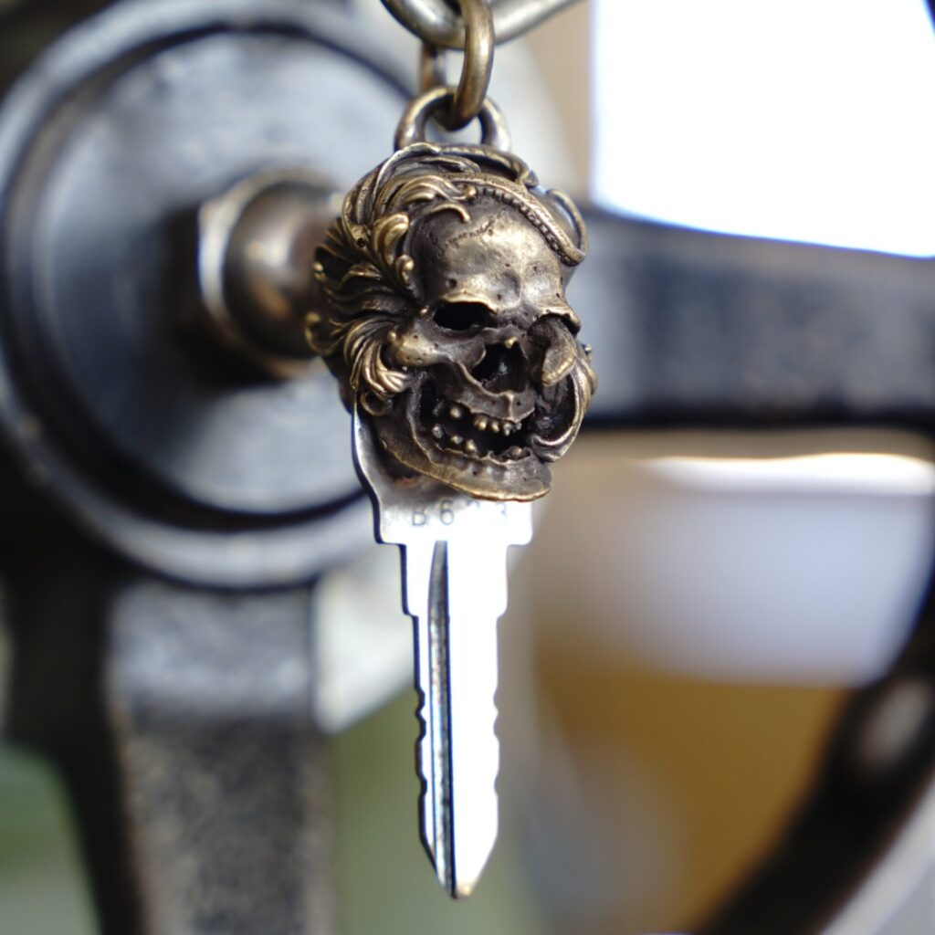 今回ご紹介するのは、「唐草スカル」モデルと呼ばれる特別な鍵。東京で活躍されている「GINZO」の小宮山氏の作品で、シルバーアクセサリー職人として多方面で評価されている方です。アクセサリーだけでなく、バイク乗りのための鍵カスタムも手掛けてくださっており、繊細でありながら存在感のある仕上がりは、まさに一点モノの魅力。当店のブログでもいくつかサンプルをご覧いただけますし、ギンゾーさんの公式サイトにもたくさんの作品が掲載されています。小さな部品だからこそ、手を加えると一気にあなたのバイクらしさが際立ちます。ぜひ世界にひとつだけの鍵にカスタムしてみてください♪