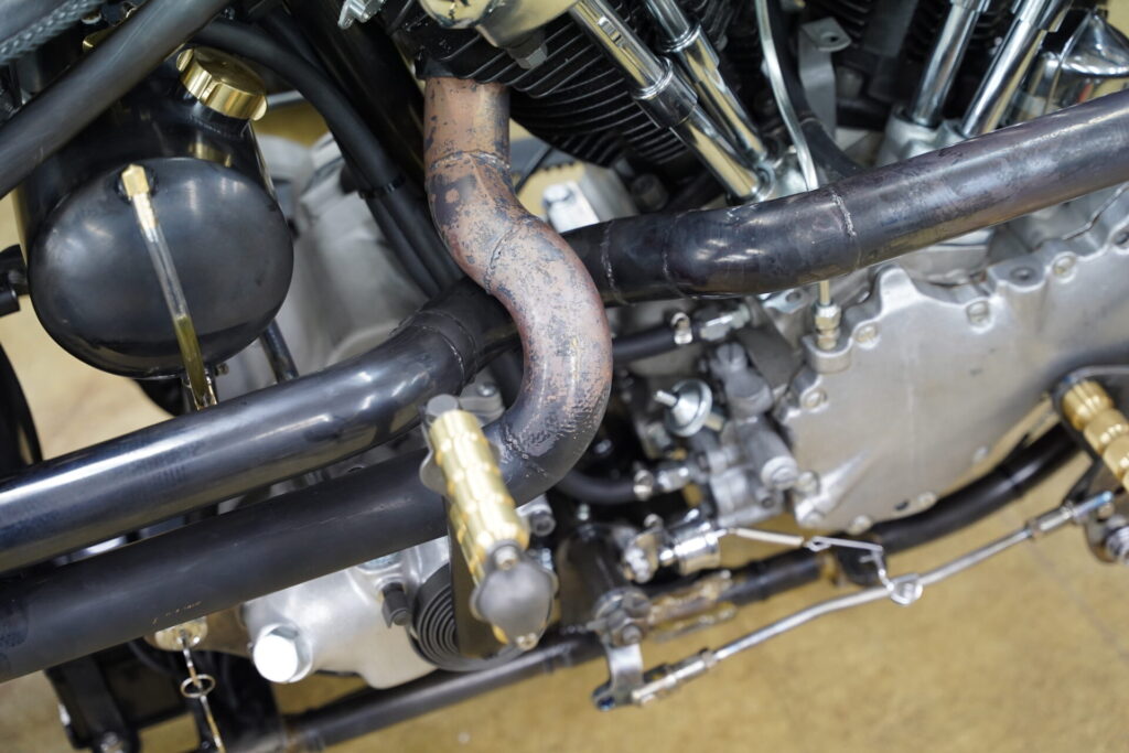 さらに、今日はマフラーのエイジングもテスト。元は 銅メッキ → 黒染め加工を施したピカピカの状態でしたが、エンジン始動からわずか1時間ほどで、まるで何年も乗り込んだかのような“ヤレ感”へと一気に変化しました。こういった自然な風合いは、黒塗装やクローム仕上げでは出せない魅力があります。