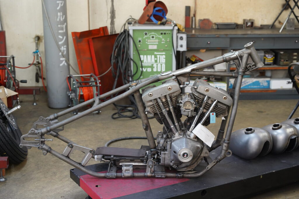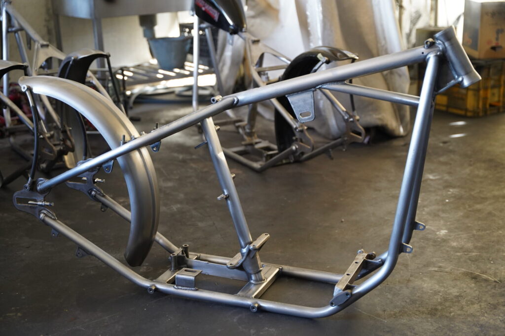 クラフトテック製は、上記2種と比較しますと比較的ガッチリした印象のフレーム。使用されているパイプ径が太いため、強度を増している点がイイところです。リジットフレームの中でも耐久性も高くラフに走行しても損傷は起きにくいと思います。フレームのサイズ感としては純正に近い寸法のため、スタンダードに使用することができます。チョッパーstyleでもイケますが、とくに前後タイヤが太めなタイヤを合わせたりなどのボバー系styleがお好きな方には推しです。