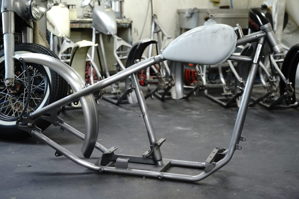 当時の純正フレーム形状を再現したタイプで、リジットカスタムにとっては相性抜群。ナックルヘッドやパンヘッドならより一層相性良し。なぜなら、その当時の純正採用されている形状だからです。ハーレー純正フレームは鋳物部品をフレーム構造に取り入れており、その風合いがなんといってもオールドスクールなチョッパーには合います。迷ったらコレ!と言ってもイイほど安心感のある選択肢です。