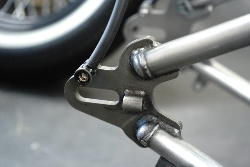 Harley-Davidson は1957年までは純正でリジットフレームを採用していました。つまり、パンヘッド時代を含めた長い期間、リアサスペンションが無いのが当たり前だったわけです。1958年にデュオグライドが登場して、ようやくリアサス付きフレームが純正化されます。なので「リジット=無理してるカスタム」ではなく、リジットこそが原点という見方のほうが、オオガキ的にはしっくりきます。リジットフレームとは、リアサスペンションを持たないフレーム構造のこと。ハードテールと言われているフレームも同じくサスペンションを持たないという意味で同じです。リアアクスルはフレームに完全固定されており、路面からの衝撃はダイレクトに伝わってきます。正直に言いますが、乗り心地は良くありません(笑)。