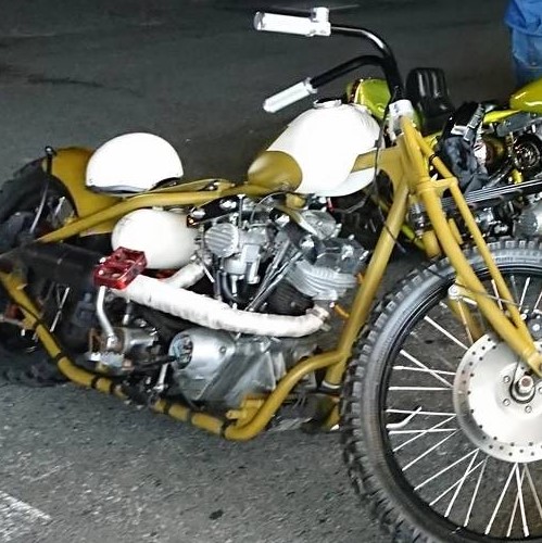 完成後はオオガキ自身が乗ることを前提に製作していた車両でもあり、ライディングポジションは完全にオオガキ仕様。スタイルとしては、グースボバーな雰囲気をベースにしながら、どこかボードトラックレーサーのイメージをミックスしたようなカスタム。見た目はシンプルですが、かなり尖った一台だったと思います。