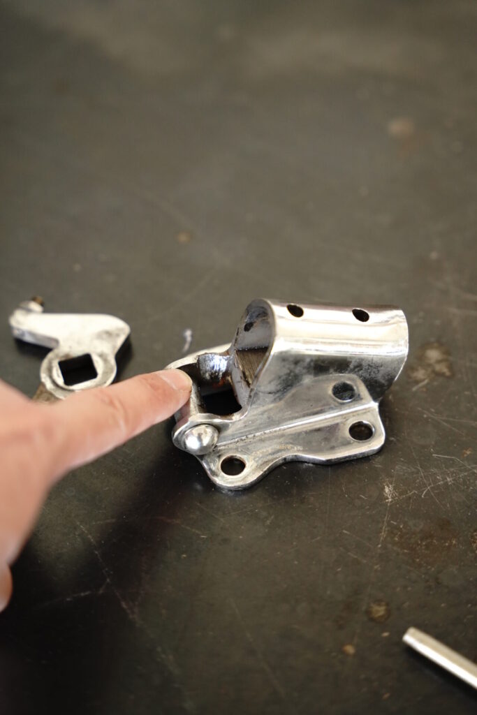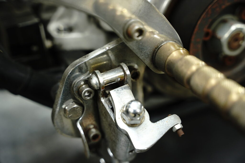 まず、ビックリしたのがサイドスタンド。かなりフラフラな状態で、取り扱い要注意レベルでした。オーナー様はすでに慣れていたので「気をつけてください!」ってアドバイス下さっていました(^_^;)キックスタート車両ではよくある話なのですが、キックを何度も試みるたびに、どうしてもサイドスタンドへ負担が集中してしまいます。これは構造上、避けられない部分でもあります。