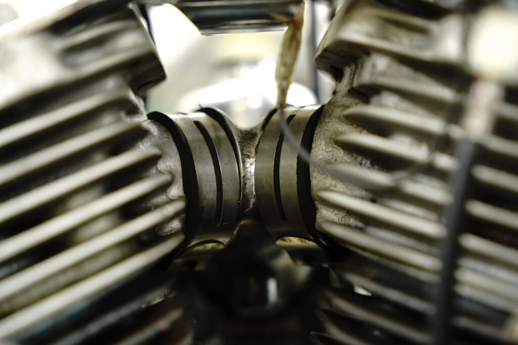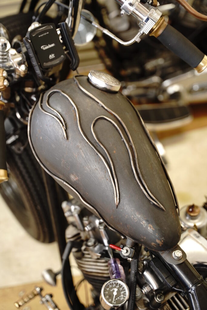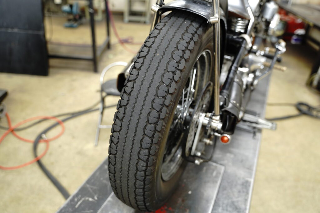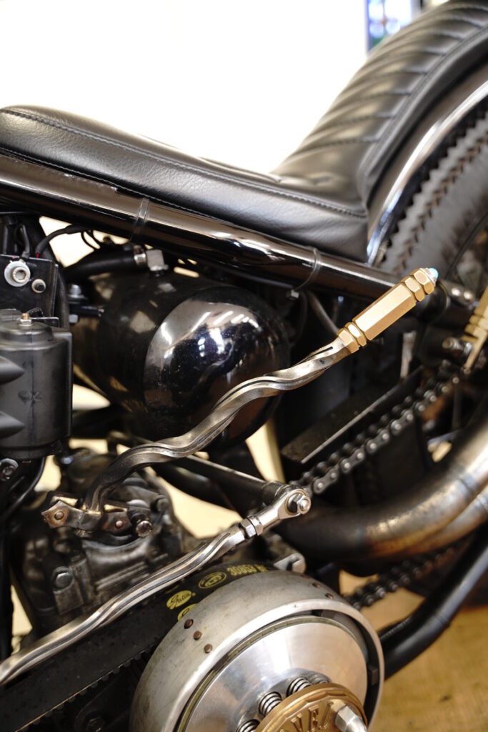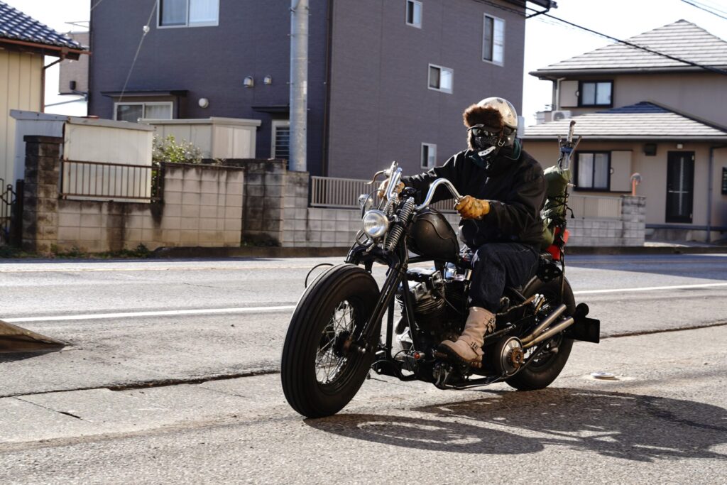 せっかくお会いできましたので、オオガキもちょこっとだけバイクを拝借し、コンディションチェックも兼ねて乗らせていただきました。まず気持ちイイのがマフラー音。とても特徴的なエキゾーストノートで、「これ本当にショベル?」と思ってしまうほど、図太くて迫力のある、めちゃくちゃカッコいい音を奏でてくれます。
