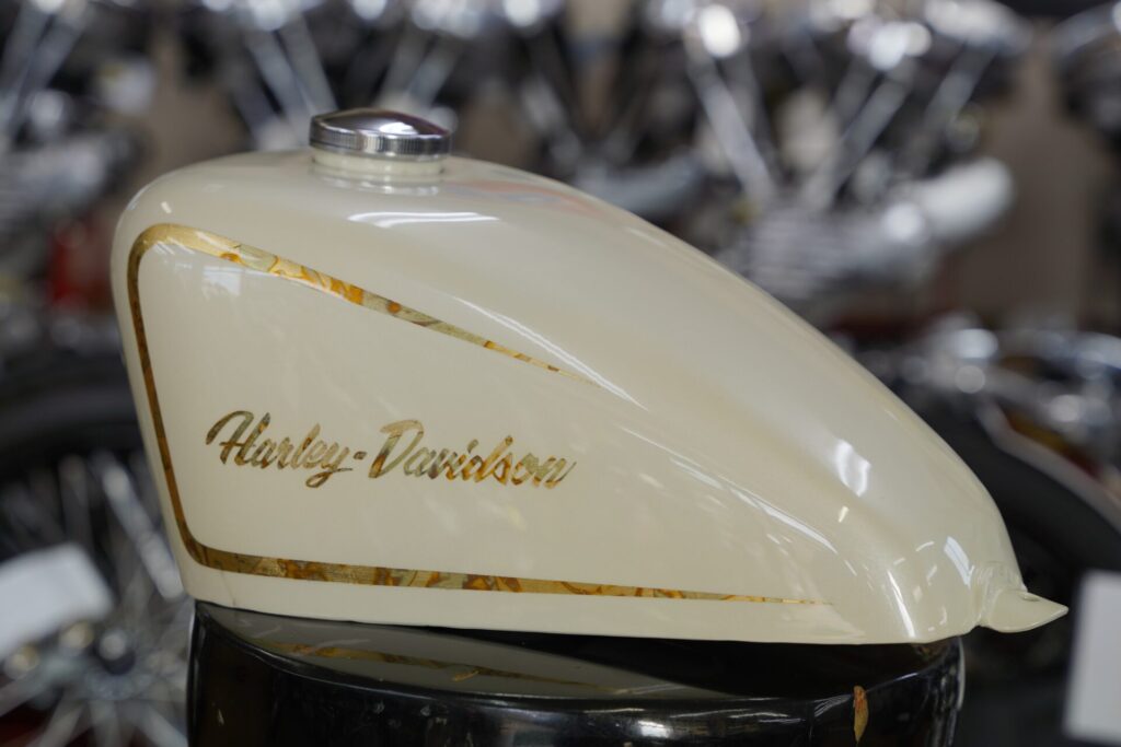 スポーツスタータンクの流れるような形状に合わせて、細部にまでこだわり抜いたラインをゴールドリーフで丁寧に引きました。タンク中央には「HARLEY-DAVIDSON」のロゴも同じくゴールドリーフにて施され、高級感と存在感を放っています。