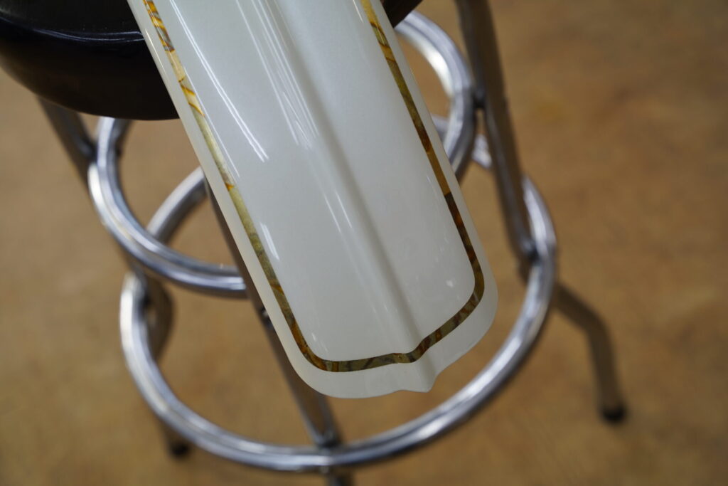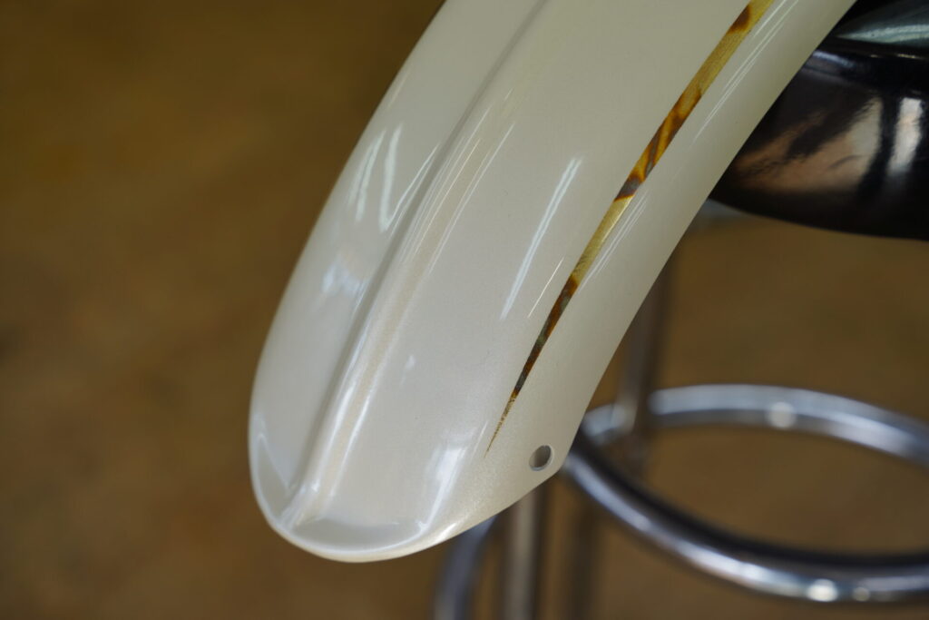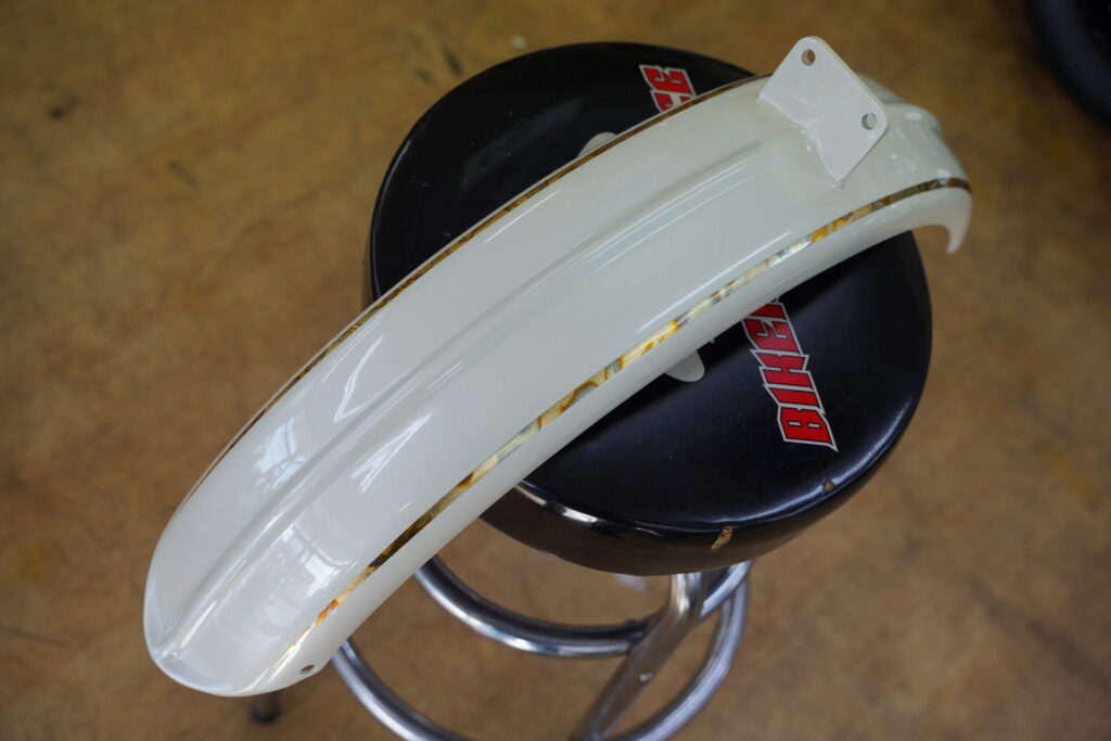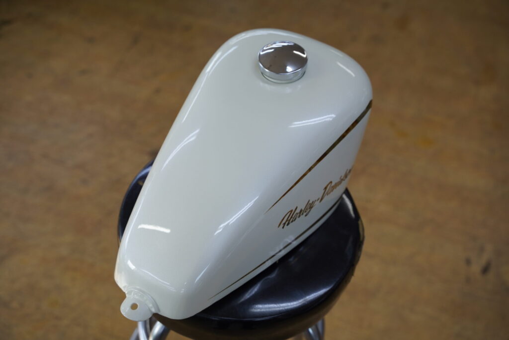 本日まずご紹介しますのは、できあがったばかりのタンク&フェンダーのペイントです♪お客様からのご依頼を受け、アイボリーをベースにしたパール仕上げのカスタムペイントを完成させました。柔らかなアイボリーの色味に、光の角度によってキラキラと上品に輝くパールが絶妙にマッチし、写真では伝えきれないほど美しい質感に仕上がっています。