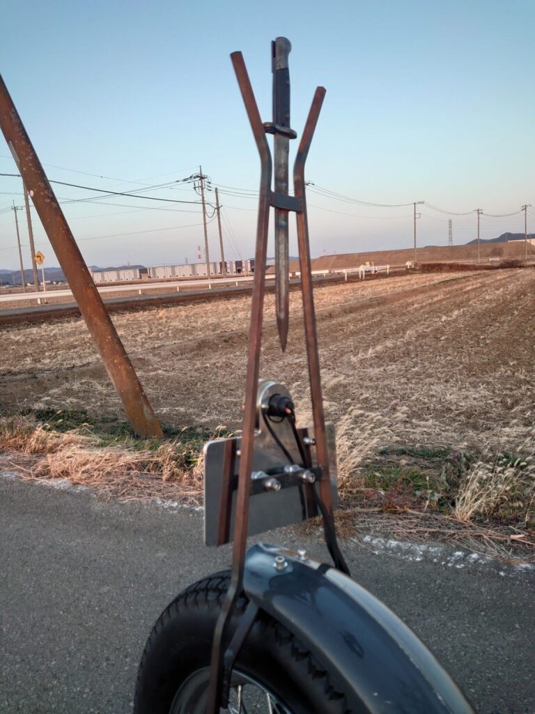 そして、ひときわ目を引くのがシーシーバー。こちらは“銃剣”を使用して製作しています。ハンドルよりも高くそびえ立つその存在感は、どこに停めていても一発で分かるレベル。正直、このデザインを最初に思いついた人は天才だと思います(笑)。