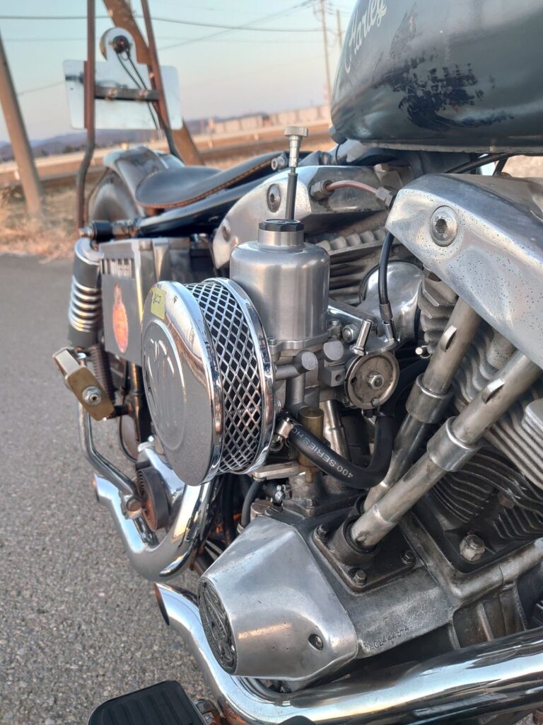 “ちょっとだけ”カスタムを加えさせていただいた一台で、フレーム、エンジン、ミッション、プライマリーといったバイクの心臓部は、あえて手を入れずに純正のまま。このショベル本来の鼓動やフィーリングは、できるだけ純正を残したいコンセプトで、大部分はノーマルをキープしています。