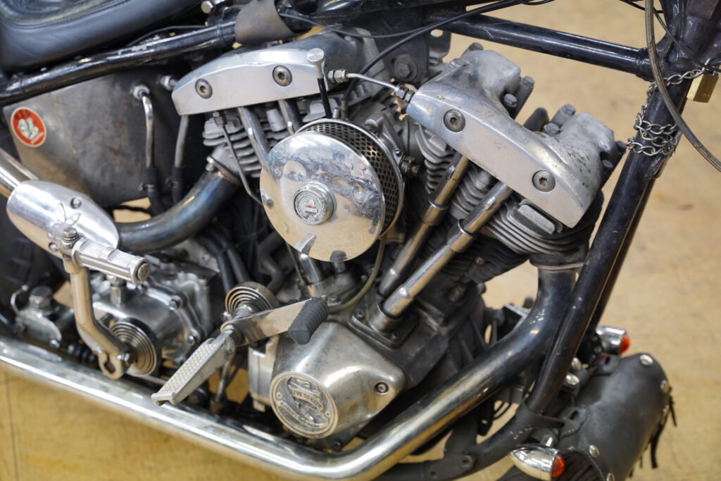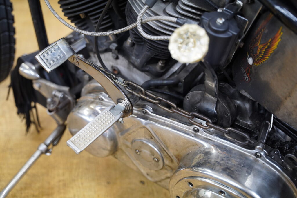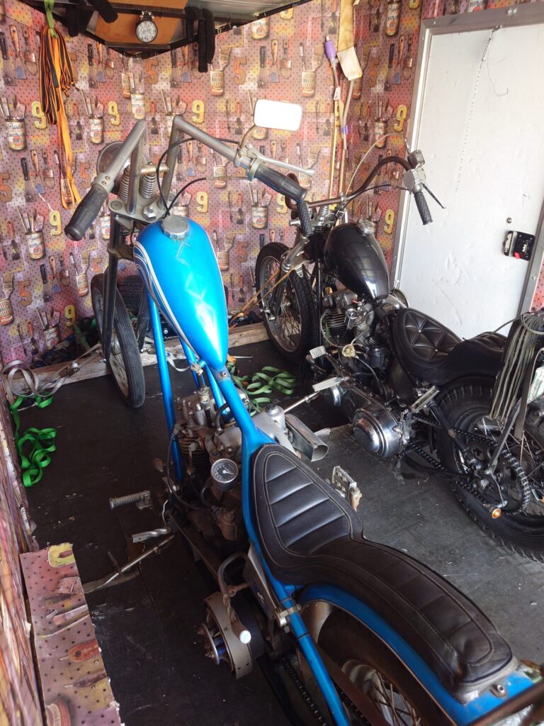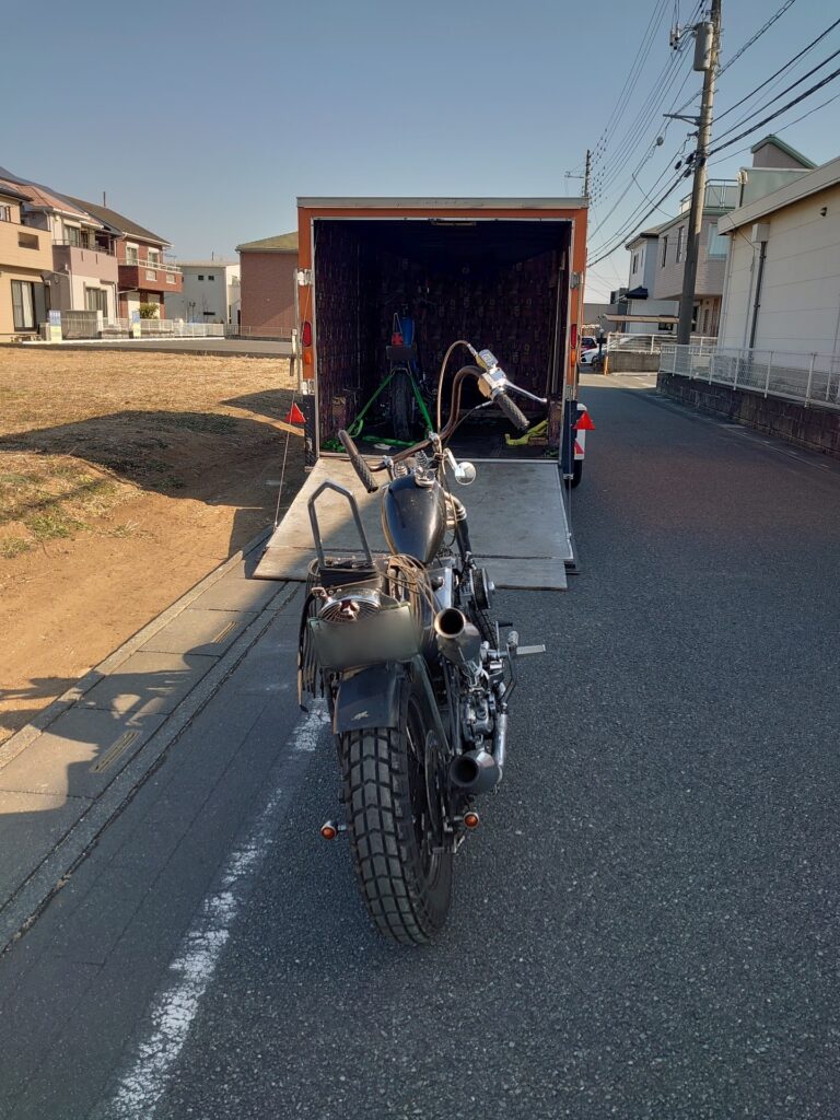 一方、黒のショベルヘッド様は、先日キックスターター周りの修理でお預かりしていた車両で、本日はそのお届けの日でした。トレーラーは少し離れた場所に停め、そこからはオオガキ自身がバイクにまたがり、エンジンをかけて保管場所まで走ってお届けします。走り出した瞬間から、このチョッパーがしっかりと“乗られてきた一台”だということが伝わってきます。