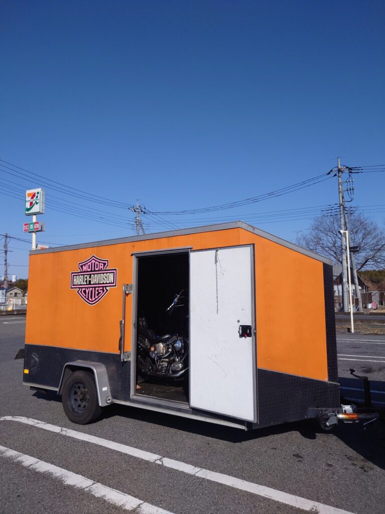 今回の車両はロングチョッパーということもあり、念のためトレーラーを連結して向かいます。キャラバンでもギリギリ積載できる長さではあるのですが、万が一、積み込みの段階で入らなかったら現地で立ち往生…なんてことになってしまいますので、こういう時は少し慎重なくらいがちょうどいいですね。