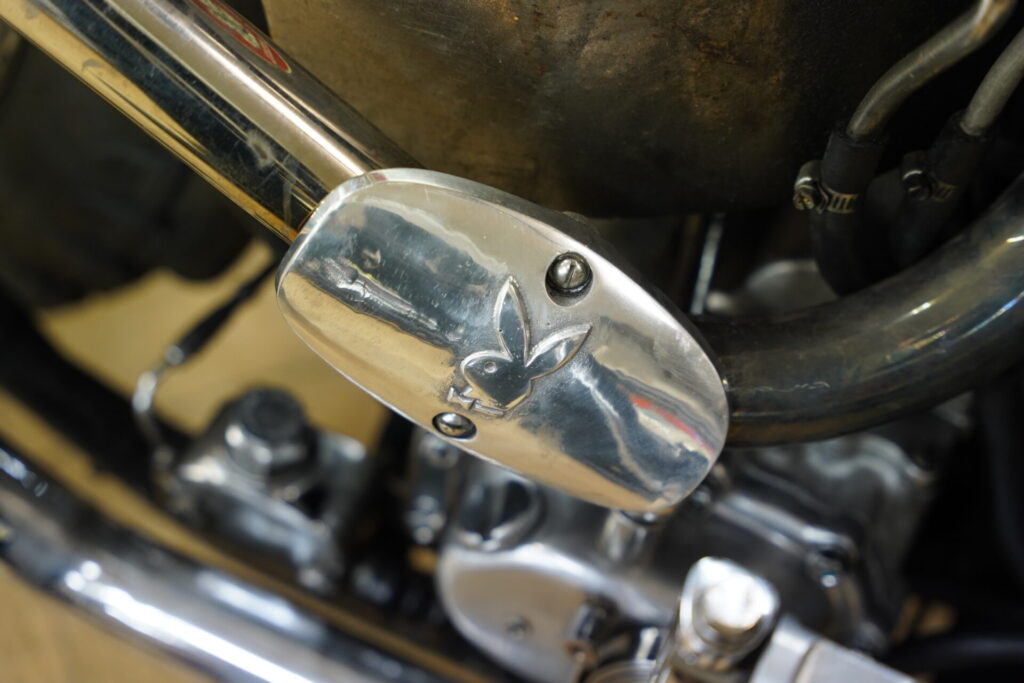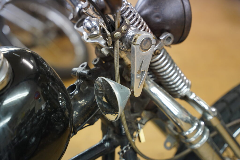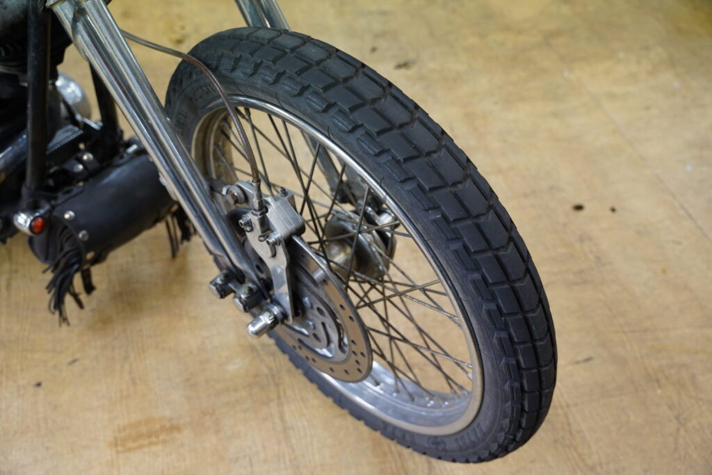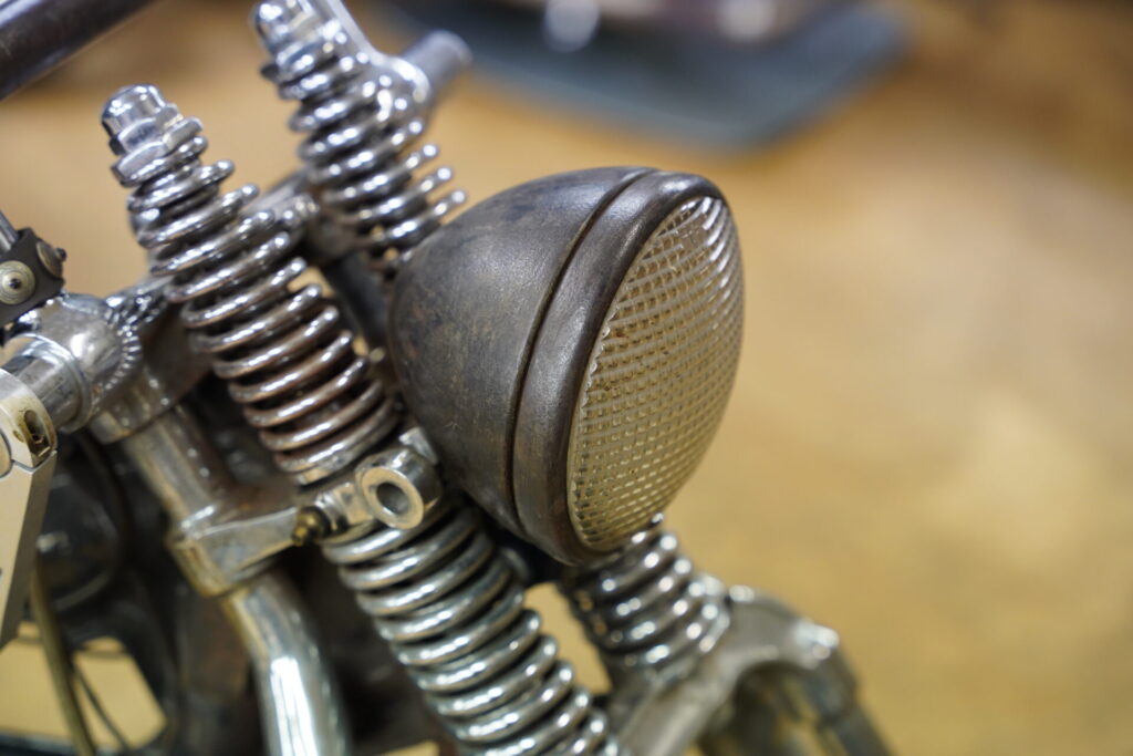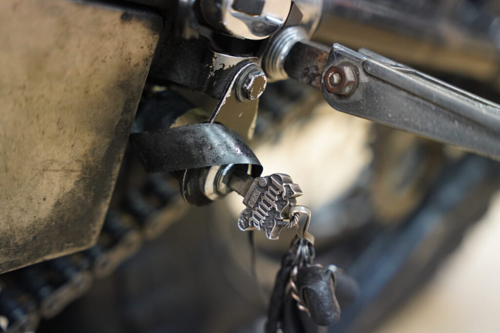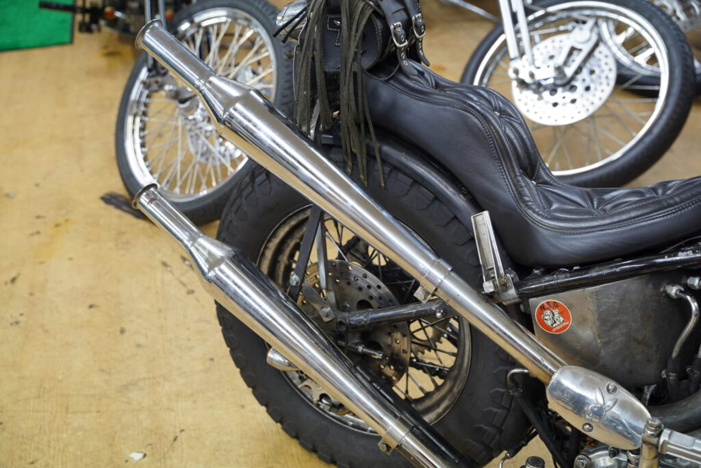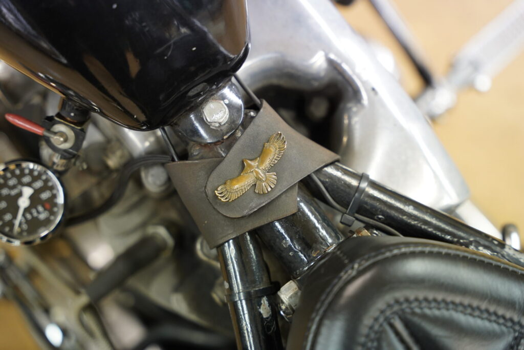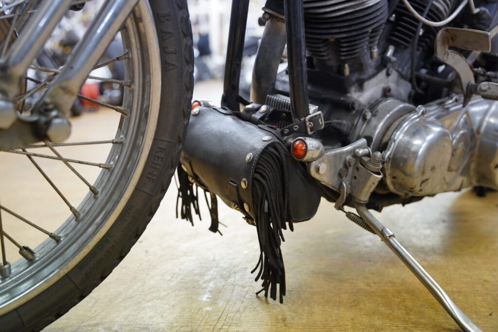 ハイセンスなレザーバッグが目に留まり、「これはどこで売っているんですか?」とお聞きしたところ、なんとオーナー様ご自身のハンドメイドとのこと。特にシート後方に取り付けられているレザーバッグは、サイズ感も可愛らしく、車両の雰囲気にぴったりで、思わず見入ってしまいました。揺れるフリンジも、このチョッパーのシルエットと相まって、走っている姿を想像するだけでニヤけてしまいます。