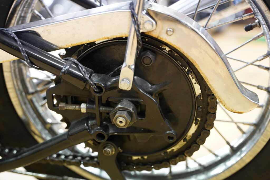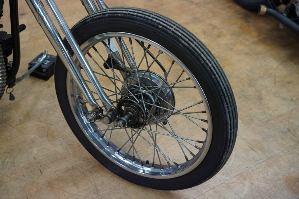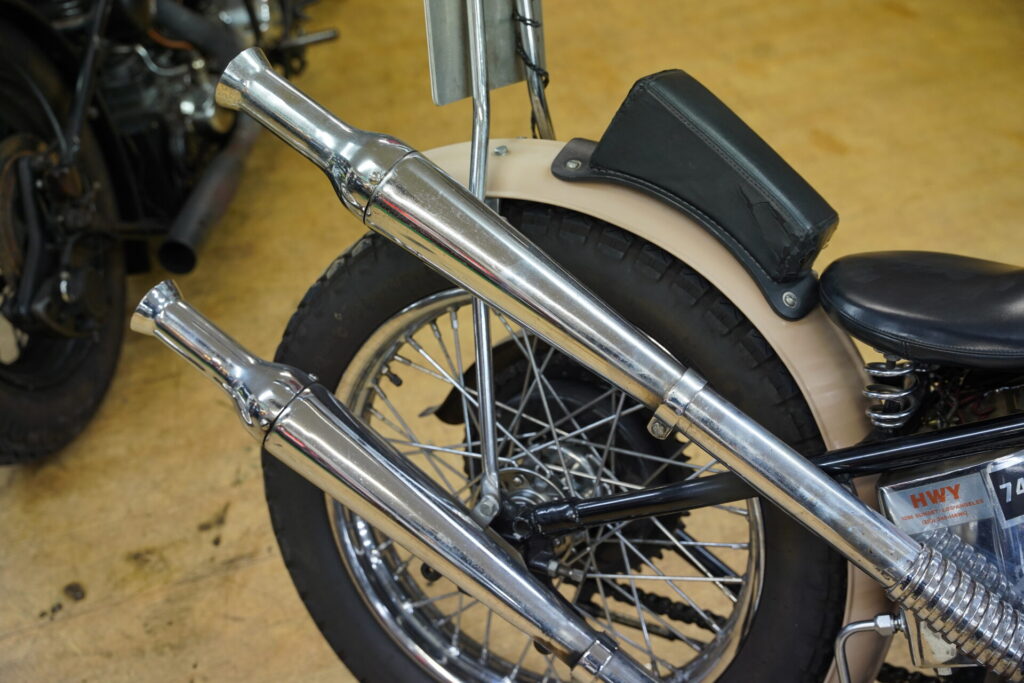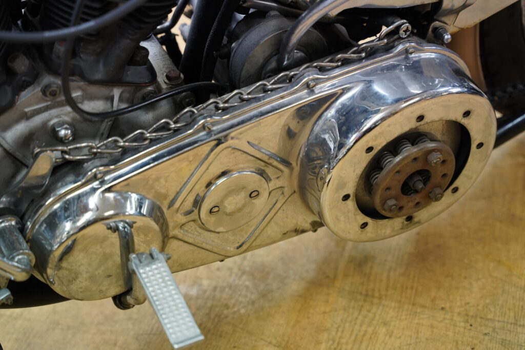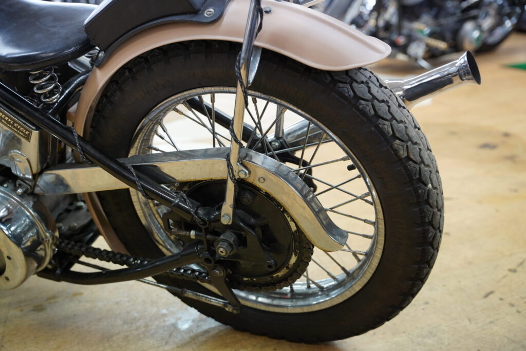 そしてシーシーバーは、シンプルながらも程よい太さの丸棒でワンオフされたような仕上がり。見た目のバランスが良いだけでなく、荷物を積んだりタンデム時の安心感にもつながる、しっかりと“使える”パーツになっています。マフラーはアップスイープタイプ に、いわゆるカクテルシェイカー(トランペット)タイプのサイレンサーを装着。この古いスタイルのサイレンサーから奏でられる音が、また本当に独特で言葉ではなかなか表現しきれない、乾いたようでいて太さも感じられる、パンヘッドらしい存在感のあるサウンドです。リア周りは 18インチホイール に、ヴィンテージルックのタイヤを装着。ブレーキはフロント同様ドラム仕様で、全体のクラシックな雰囲気をしっかりと統一しています。プライマリーには、パンヘッドらしいスチールカバーを装着し、シフトはジョッキーシフト+ノンロッカークラッチ。操作そのものも、このバイクの“楽しみ”の一部として味わえる仕様になっていて、乗り手との距離が近い、そんな感覚を与えてくれます。