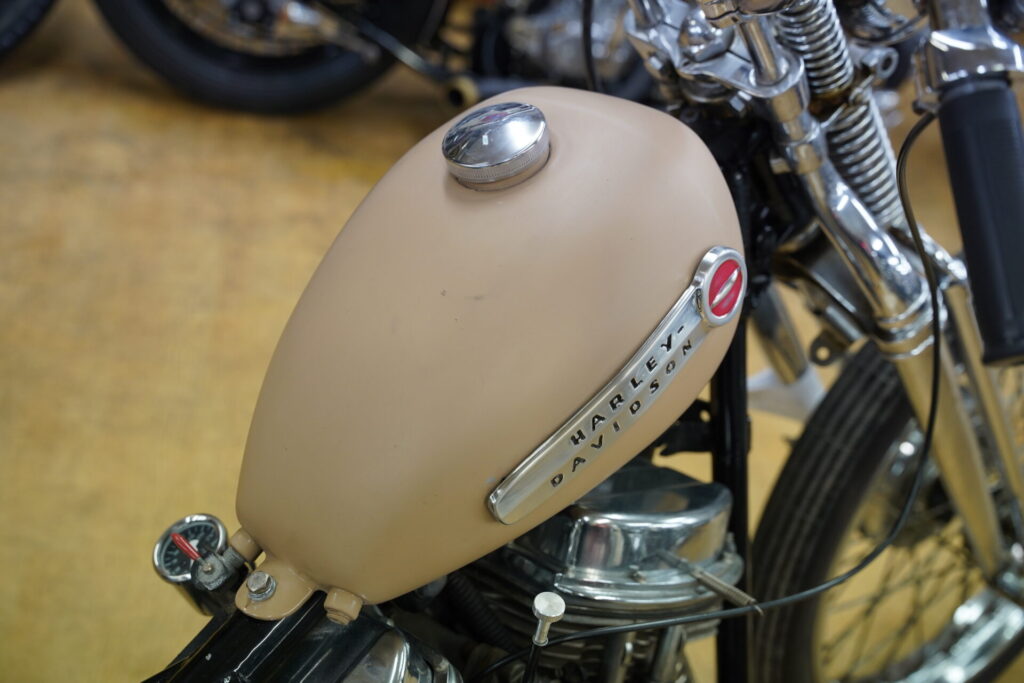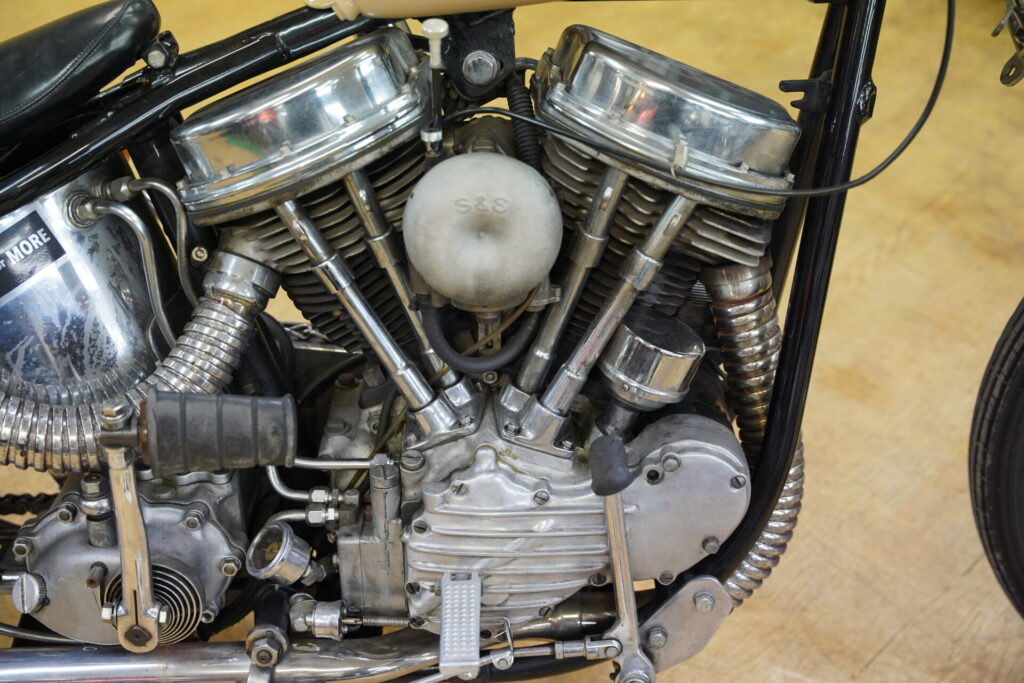 まず心臓部となるエンジンは1958年式のパンヘッド。キャブレターにはS&S製Eキャブレター、点火系は自動進角デスビを採用し、扱いやすさを意識した構成になっています。さらに、8フィンのカムギアケースカバー、アルミ製オイルポンプが組み合わされ、機能面だけでなく見た目のバランスも非常に良い仕上がりです。