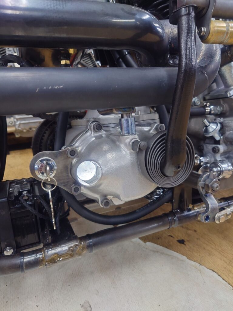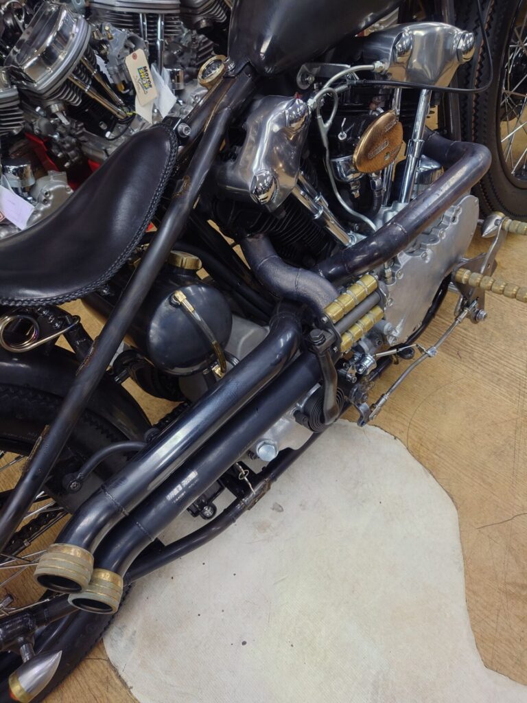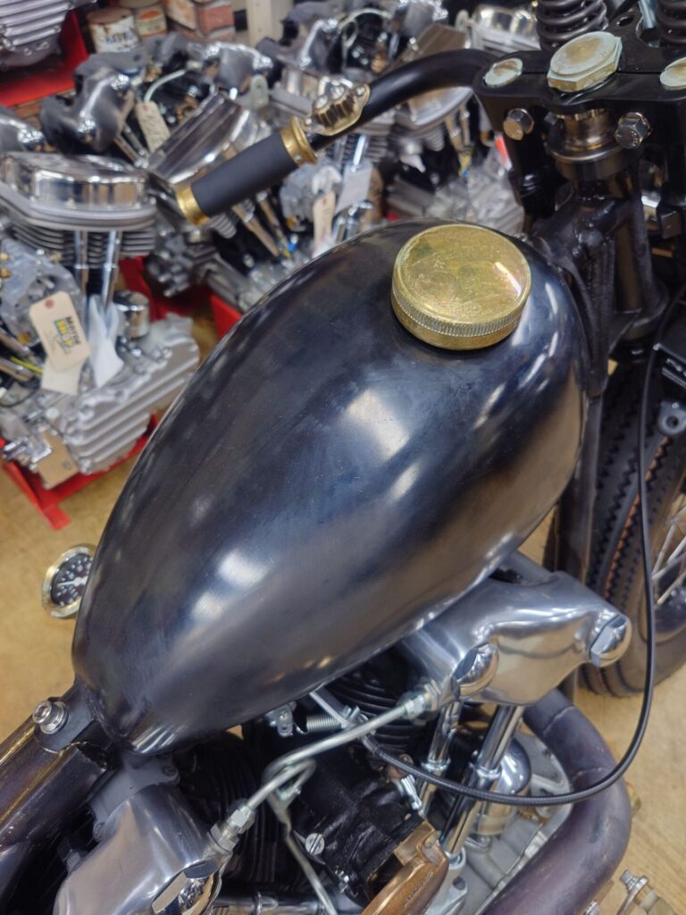 「ナックルなのに、どうして新品なの?」と思われますが、、、今回搭載しているのは、V-Twin(ブイツイン)というパーツメーカーによって新品で組み上げられたナックルエンジンです。そもそもこのV-Twinというメーカー、ヴィンテージハーレーを修理・維持していく上では、もはや欠かせない存在とも言えるほど、幅広くパーツを供給しているメーカーなんです。エンジン内部の細かな部品に至るまで一通り揃っているので、理論上は“エンジン丸ごと一基”を新品で組み立てることも可能なわけです。今回の車両は、まさにその形。新品のナックルエンジンを搭載し、ミッションについても同様にV-Twin製品で構成されています。簡単に言ってしまえば、バイク一台を組み上げるための部品のほとんどを、このメーカーだけで揃えることもできてしまう、ということですね。