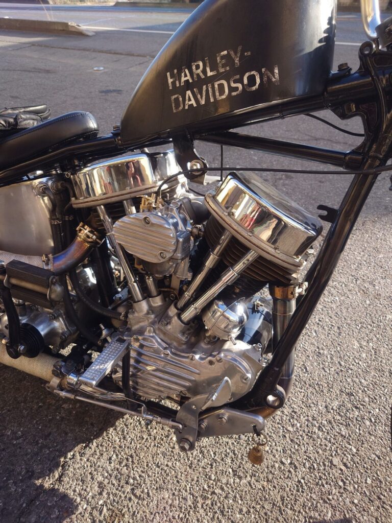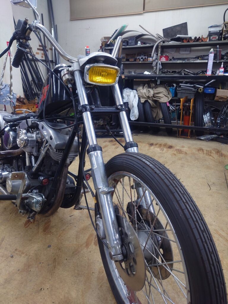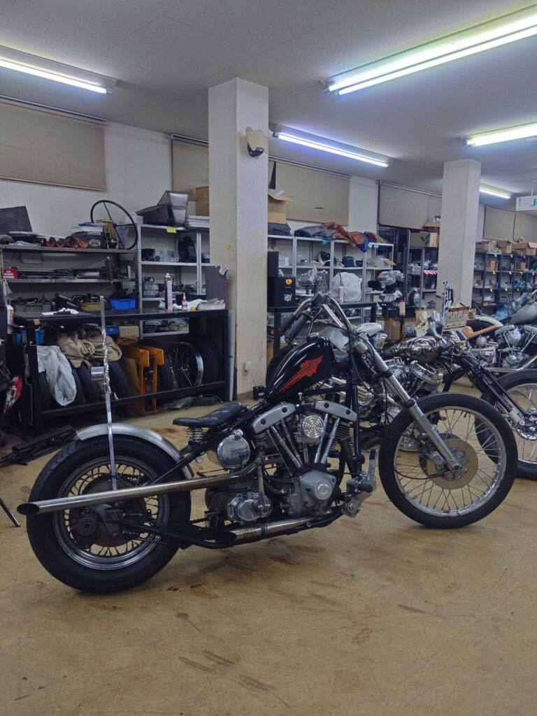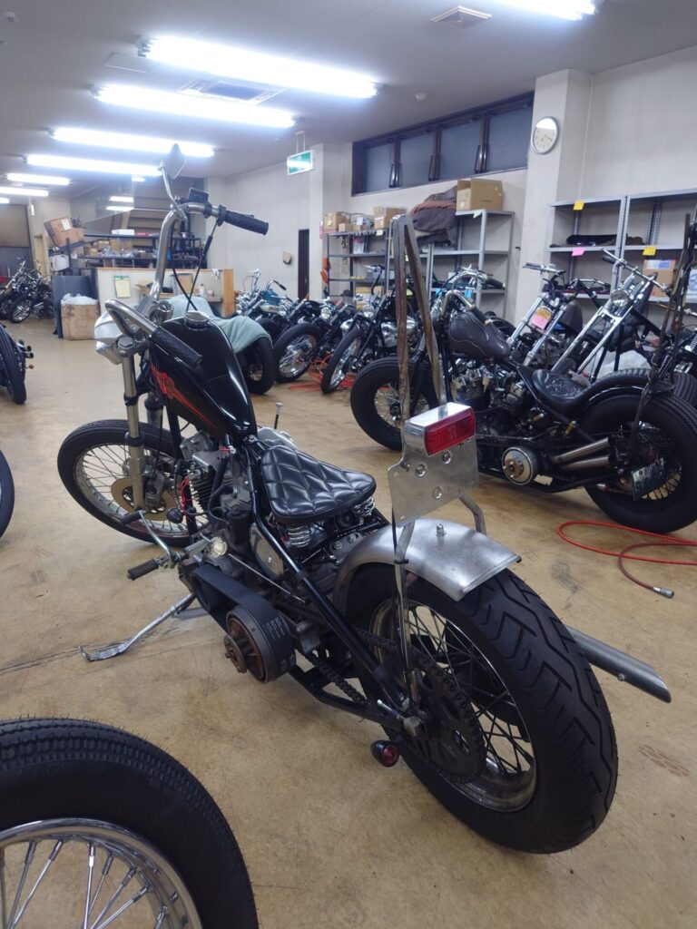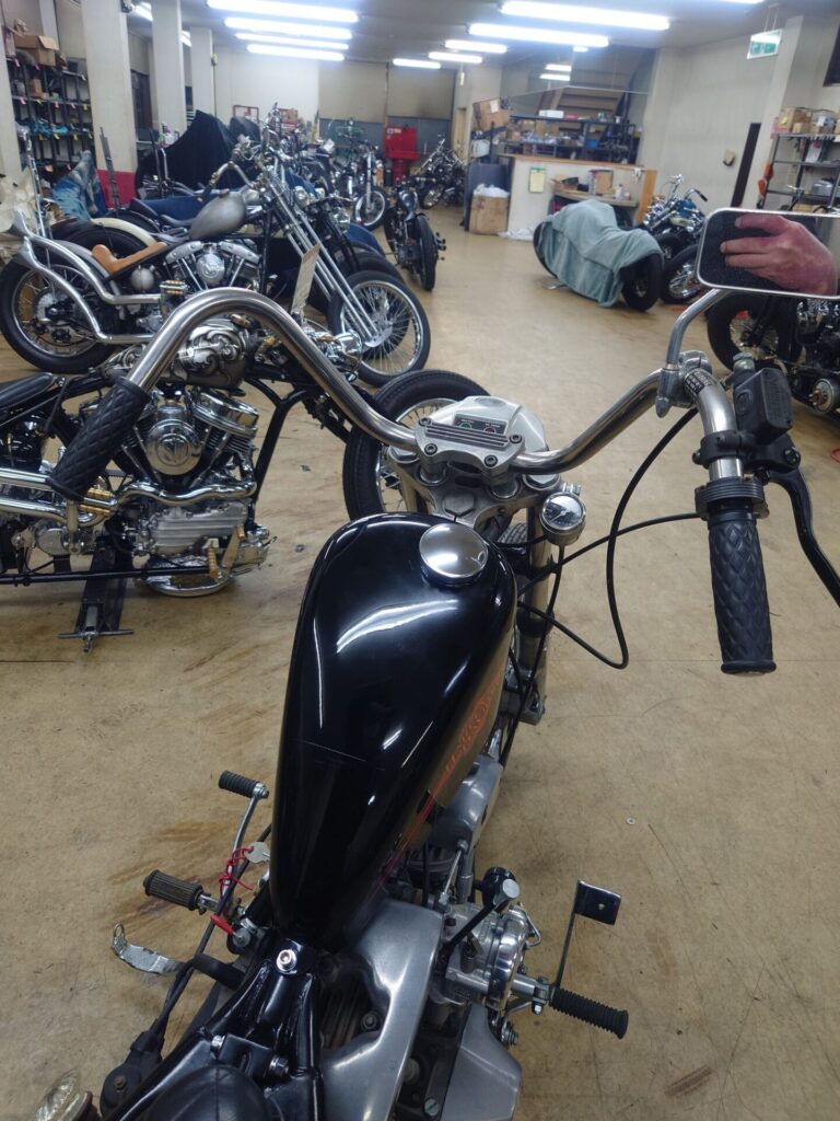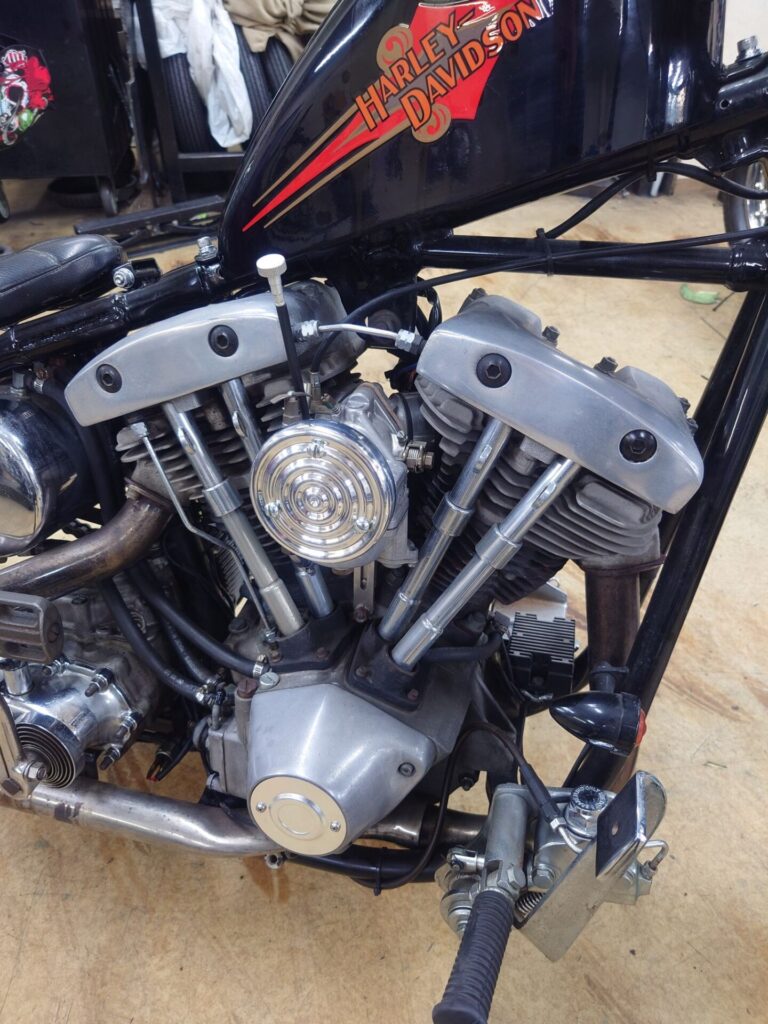 そしてそして、ちょっと前に買い取らせていただいたばかりのショベルチョッパー様。当店にて、わずかではありますがカスタムと修理を施し、本日ついに始動するところまでたどり着きましたので、ここでご紹介させていただきます。