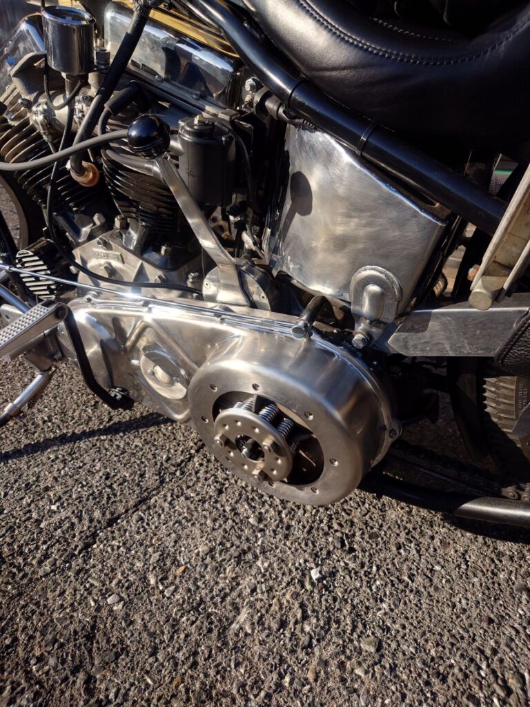 ここ最近、よくオファーをいただくのがスチールプライマリーです。このチョッパー様のように、クラッチ部分だけをあえてむき出しにするスタイルが、いかにもチョッパーらしく、人気のカスタムとなっています。パンヘッドやナックルヘッドだけでなく、ショベルヘッドにおいても、同じようにスチールプライマリーを装着することは可能です。ショベルヘッド用の既製品もきちんと販売されていますので、気になる方はぜひご相談ください。