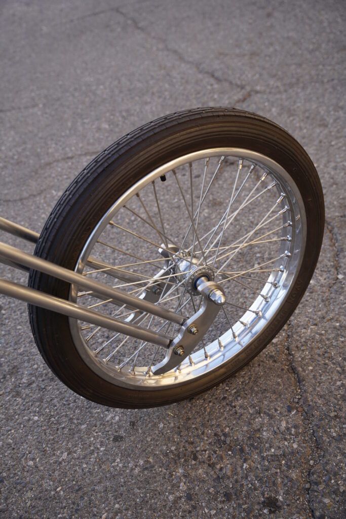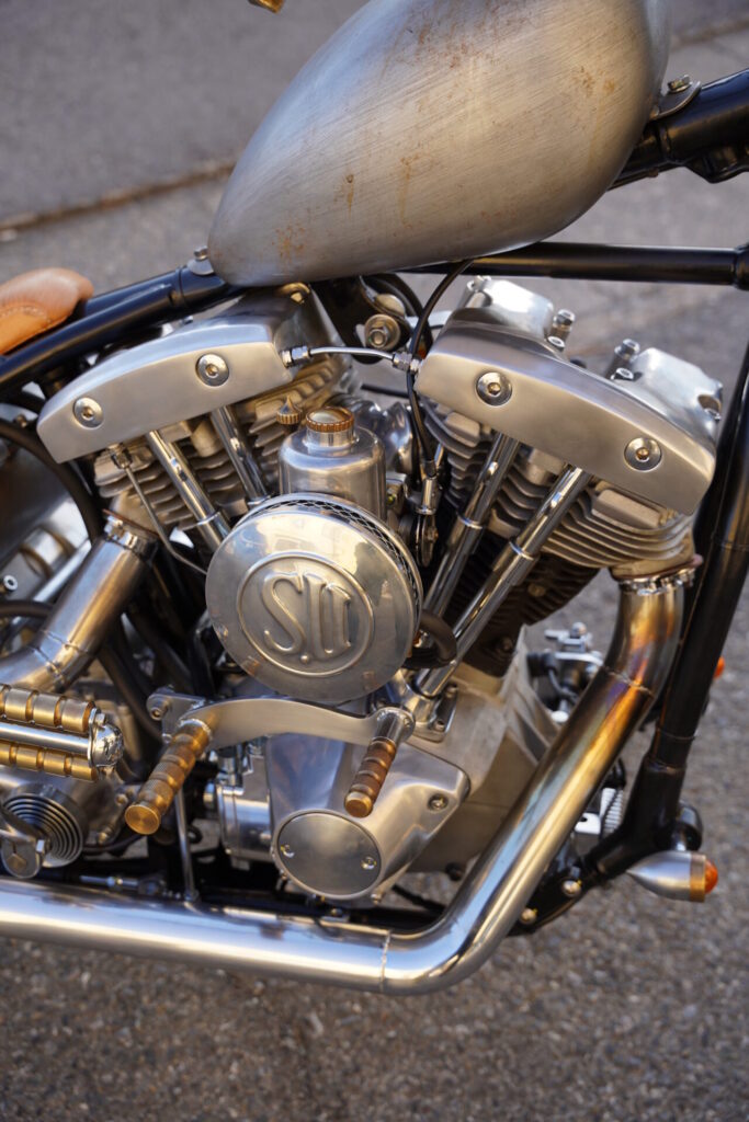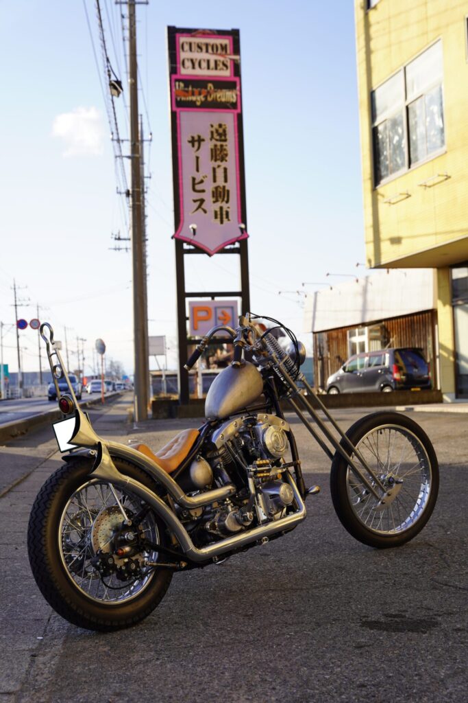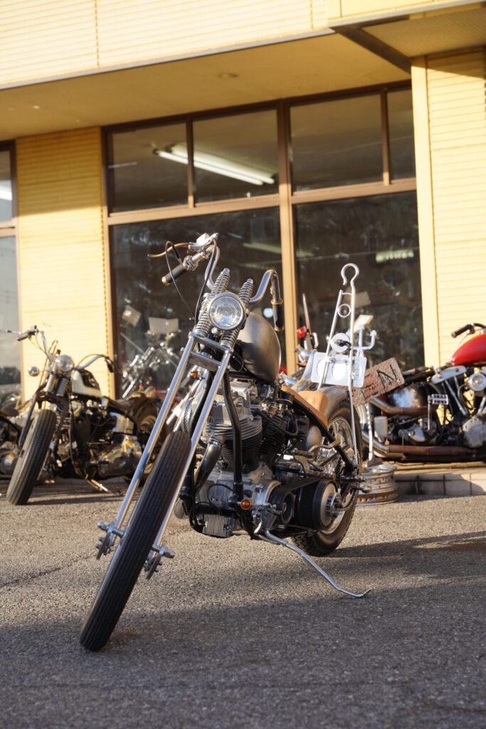 そして、このスタイルのもうひとつの魅力は、フレームに大きな改造を加えることなく、標準サイズのままでロングフォークに交換するだけで、この雰囲気を作り出せるところ。万が一「やっぱり元のスタイルに戻したい」となった時にも、比較的スムーズにリバースできるのは、オーナー様にとっても安心できるポイントではないでしょうか。細身で美しいラインを描きながらも、しっかりと日常使いができるショベルチョッパー。見た目と実用性、その両方をバランスよく楽しみたい方には、ぜひ一度体感していただきたいスタイルです。
