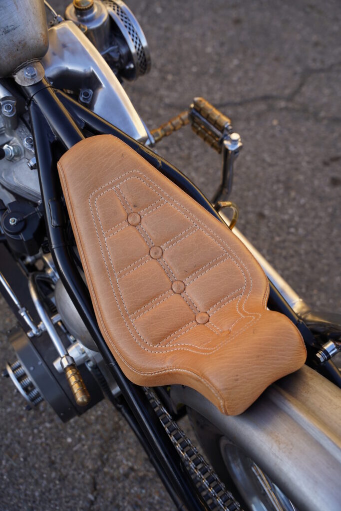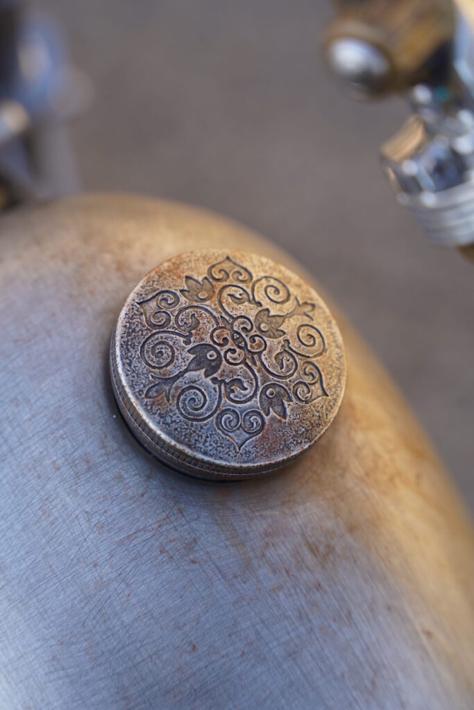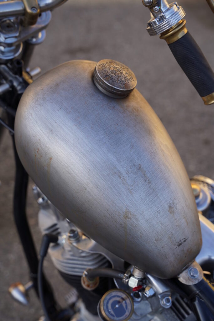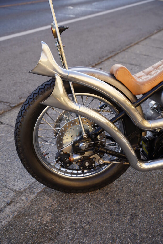 こちらのチョッパーは、なんと女性オーナー様の一台。これまではコンパクトなボバーStyleを楽しまれていましたが、今回は細身でスッと伸びたシルエットのチョッパーStyleにも挑戦していただきました。この少し長めなフォークを持つチョッパー、見た目のインパクトとは裏腹に、実はとても乗りやすく、街中から郊外のワインディングまで、道を選ばずに楽しめる万能さを持っています。確かに、取り回しの際にはハンドルが少し重く感じる場面もありますが、ひとたび走り出してしまえば、その重さはほとんど気にならなくなるはずです。