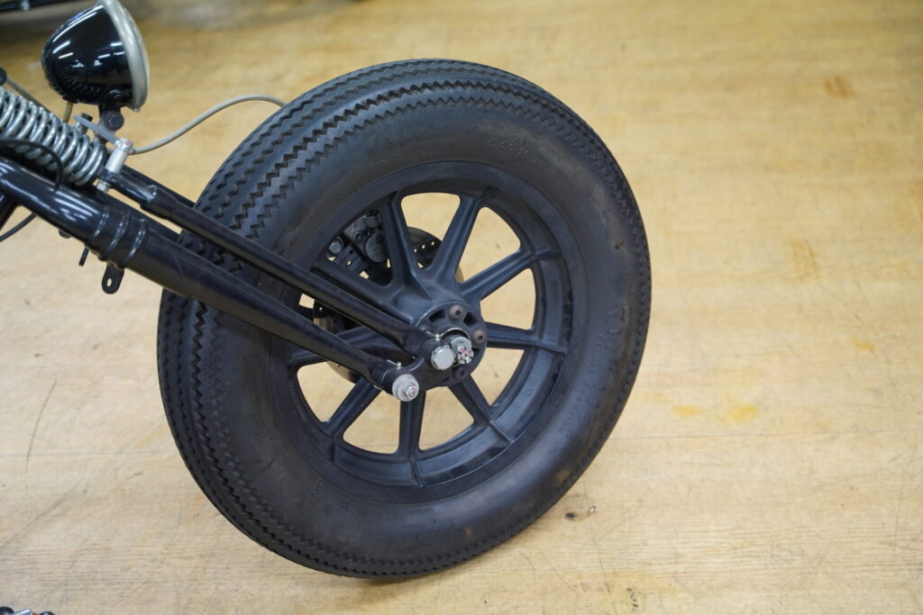 エンジンはエボリューションを搭載し、グースネックフレームをベースとしたカスタムですが、全体を眺めるとどこか一風変わった、個性の強い一台に仕上がっています。前後ホイールにはショベルヘッド時代のキャストホイールを採用し、クラシックな印象を持たせつつ、リアフェンダーは跳ね上げ仕様とすることで、グースボバーらしい軽快さの中に、ほんのりスポーティーな雰囲気をプラスしています。ガソリンタンクにはスポーツスターモデルをベースにした加工タンクを使用し、できるだけ低く、そして薄くマウントすることで、車体全体のシルエットをグッと引き締めています。このタンク位置ひとつで、バイクの印象は大きく変わるものだと改めて感じさせられます。ハンドルは一般的なドラッグバーハンドルを採用していますが、ライザーにはドッグボーンタイプを組み合わせ、シンプルな構成の中にもオールドスクールな空気感をしっかりと残しました。派手なパーツはありませんが、乗って楽しく眺めても楽しい、そんなカスタムバイクに仕上がっています!