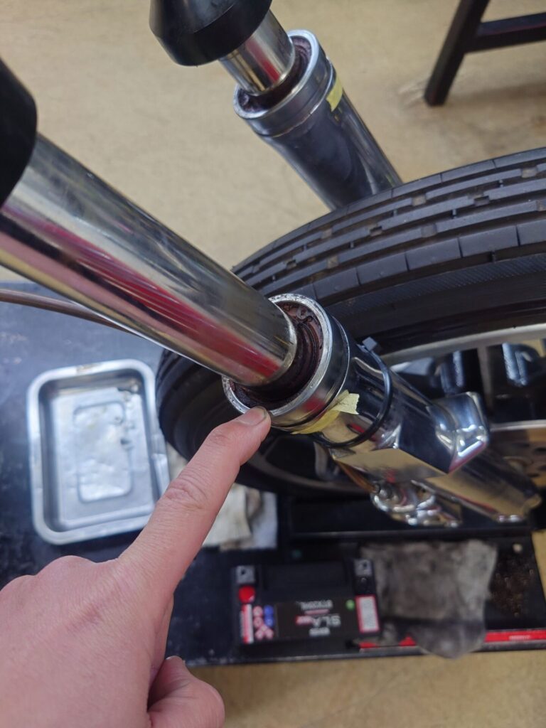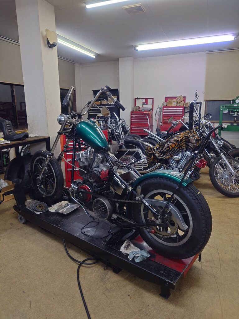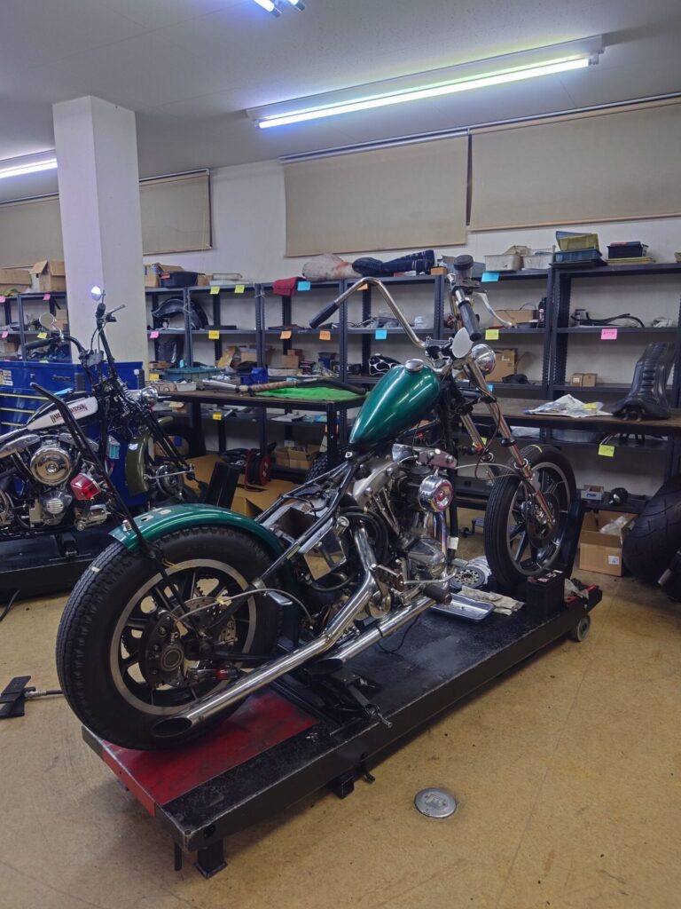 当店では比較的珍しいカスタムスタイルとなります、ロングなナローグライドフォークを組み合わせたカチ上げチョッパー様。こちらの車両は、店頭にて展示させていただいている状態から、さらにカスタムを進めていく内容に加え、外観の仕様変更だけでなく、配線の引き直しなどを含めた整備も通常よりも深めに行うご依頼となっております。見た目のインパクトが強いスタイルではありますが、こういった車両こそ、電装や取り回しなどの“見えない部分”がとても重要です。今回はそのあたりも含め、通常の整備よりも深く踏み込み、安心して長く乗っていただけるよう丁寧に仕上げていく予定です。完成後はスタイルだけでなく、走りや扱いやすさの面でもしっかりとバランスの取れた一台になるよう進めてまいります。