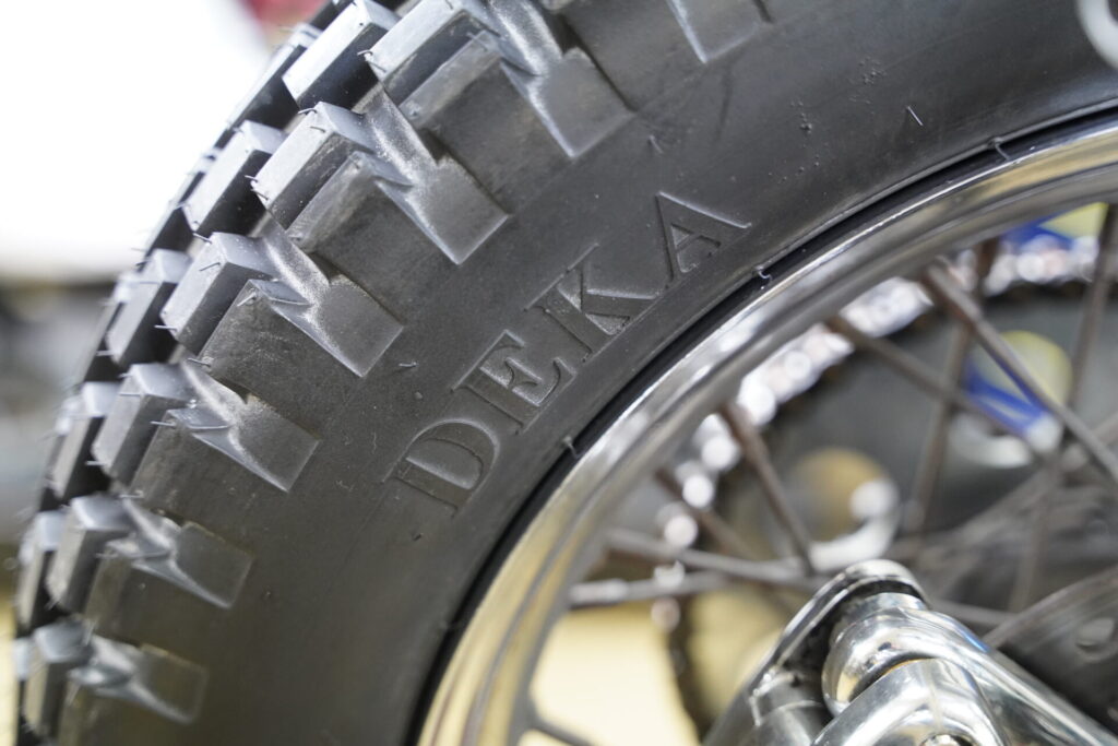 DEKAタイヤは、もともとトラックや作業車両など、いわゆる働くクルマ向けに作られていたタイヤです。当時は軍用車両にも使われていた背景があるようで、とにかく丈夫さと耐久性重視。見た目も性能も、実用一点張りなタイヤでした。深いブロックパターンや分厚いサイドウォールは、未舗装路や悪条件で使われることを前提にしたデザイン。今見ると、この無骨さが逆にカッコよく、チョッパーやトラッカー、ミリタリー寄りカスタムとの相性は抜群です。