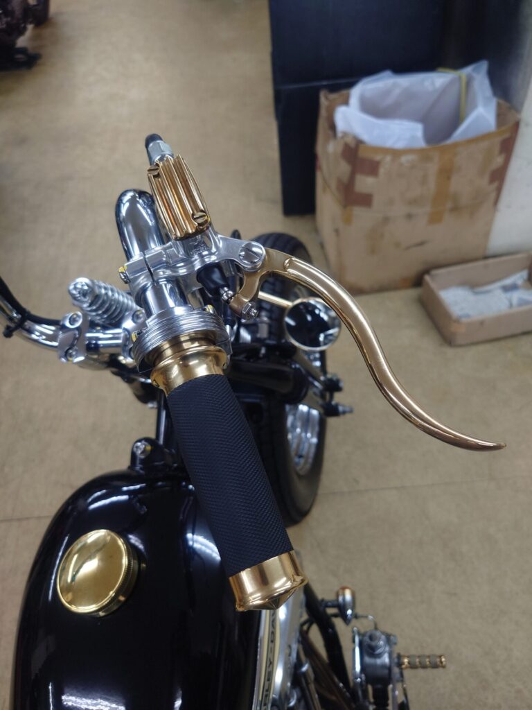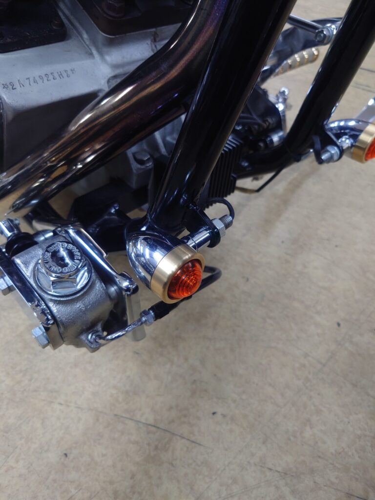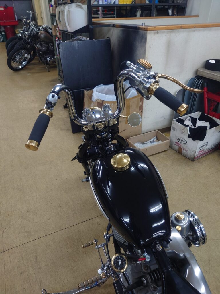 前後16インチのボバーStyleにアップタイプのブルハンドルとシーシーバーを追加してチョッパーとしての雰囲気を混ぜて完成としました。乗りやすいポジションになっていますし、シーシーバーのおかげで積載能力も十分です。