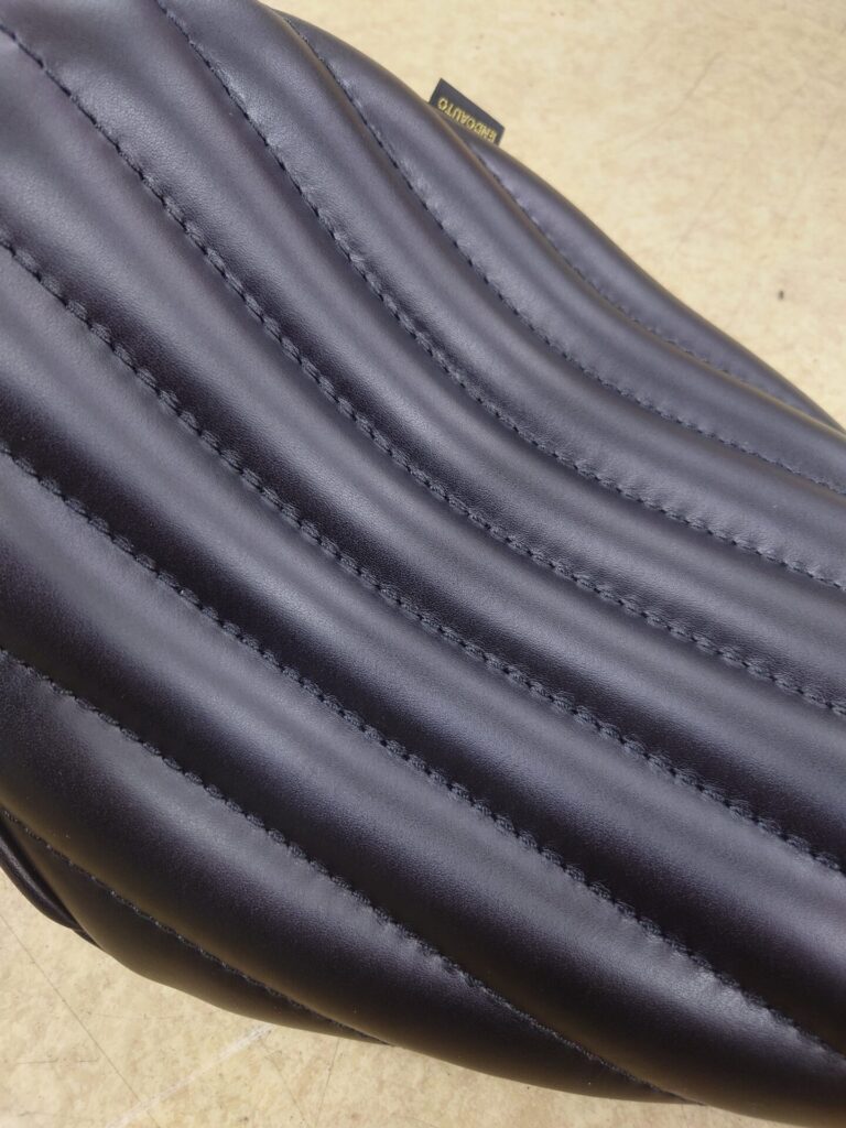 モコモコ感が強いということは、単純にクッション材の厚みと空間が確保されているということ。つまり――お尻に優しい。長時間のライディングや、振動の多いリジットフレーム車両でも、しっかりと体を受け止めてくれる安心感があります。「ソロシート=見た目重視で硬い」というイメージをお持ちの方にも、ぜひ一度体感していただきたい仕様です。