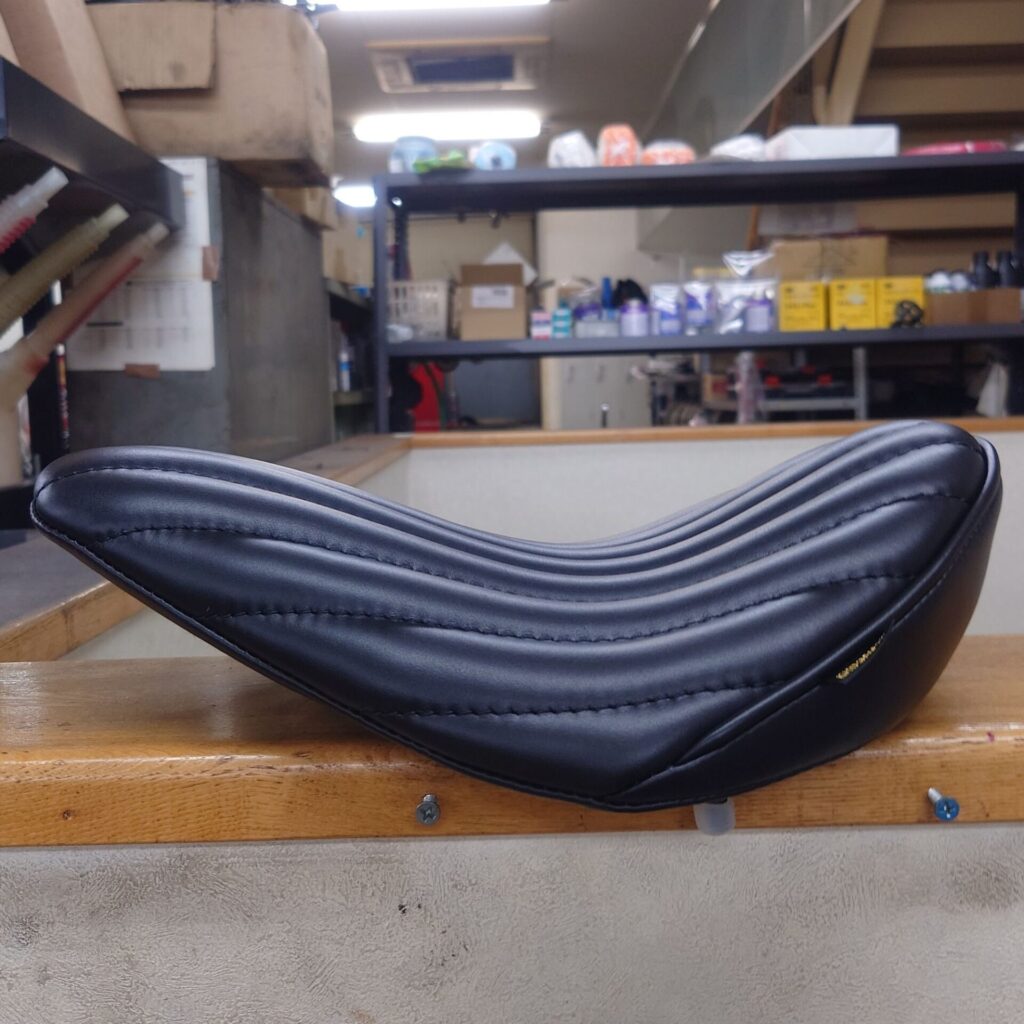 このハイバックタイプは、当店のカスタム車両でも非常に人気が高く、特にチョッパーやボバーとの相性は抜群。デザインは主にダイヤステッチとタックロールの2種類がございます。当店ではダイヤステッチ仕様のオーダーが多いのですが、オオガキ的にはタックロールもかなり推しであります。