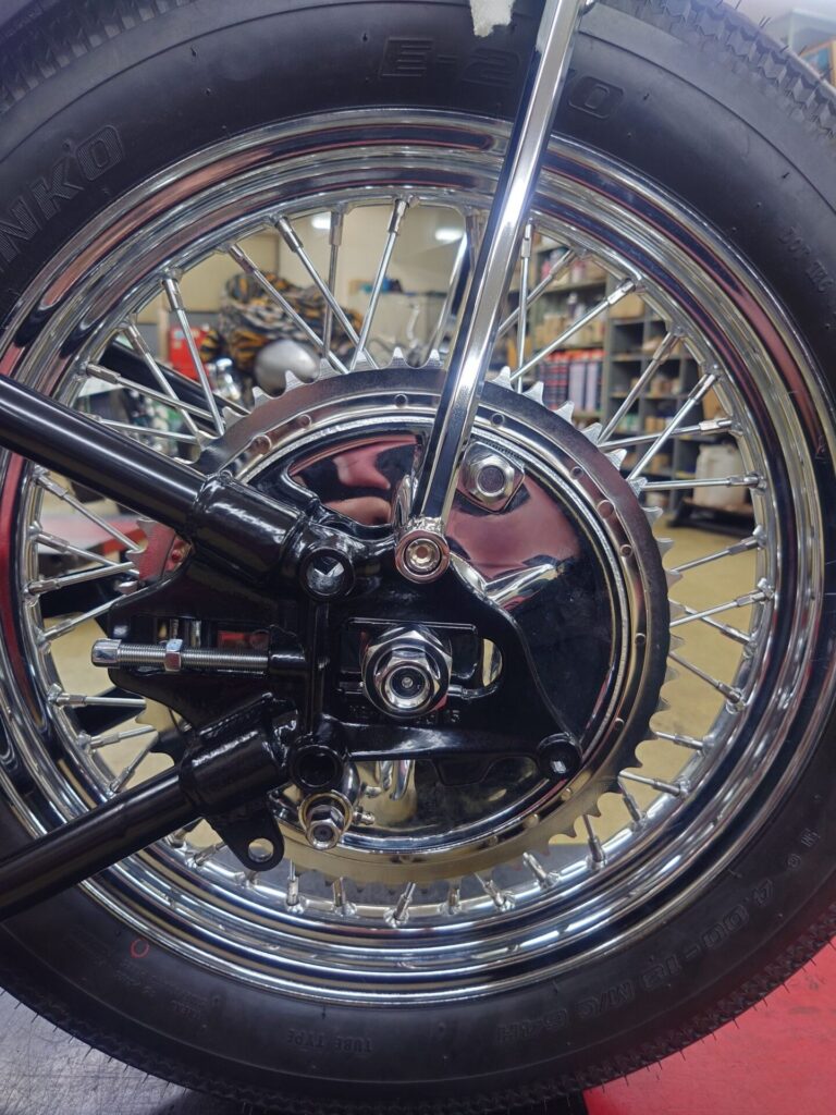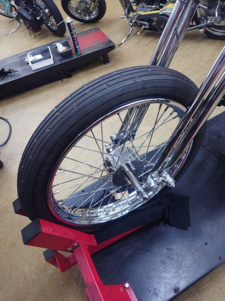 ホイールは21インチ。ブレーキは最小限とも言えるミニドラムブレーキを採用しました。正直、制動力としては「よく止まります!」というタイプではありません。でも、ないより絶対あった方がいい。そんな可愛いブレーキです。ただ、この控えめな感じも70年代チョッパーらしい雰囲気のひとつだと思っています。リアはウィッシュボーン時代の雰囲気に合わせて、ハーレー純正スタイルのドラムブレーキを装着。新品部品ですが、そのままポン付けはしません。ライニングの当たり面を事前に調整し、乗り出しからしっかり効くようにセットしています。これをやるかやらないかで、最初の安心感が全然違います。