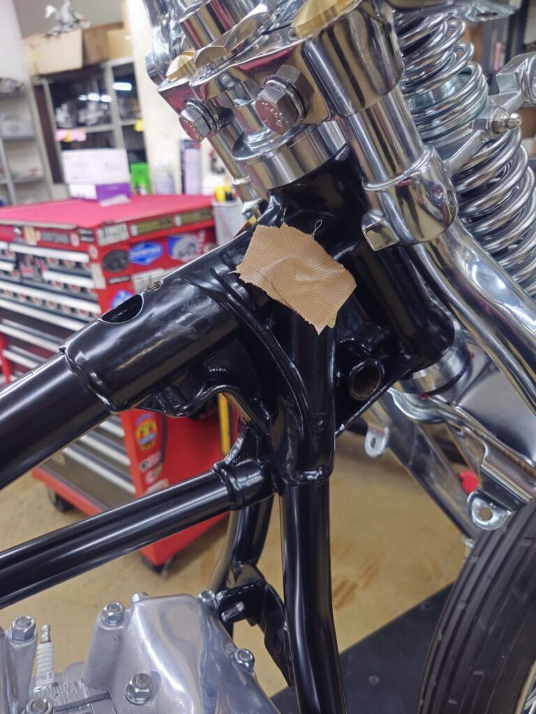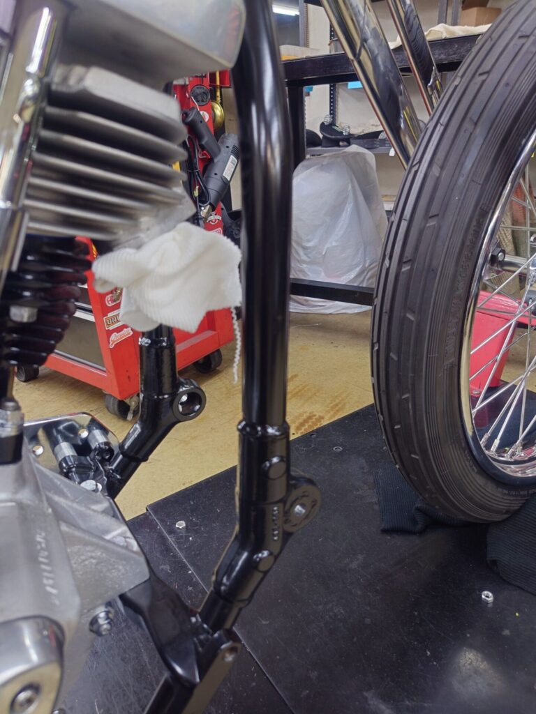 フレームはブラックのパウダーコート仕上げにしております。ただし、よくあるテカテカの艶ありブラックではありませんし、完全な艶消しでもありません。“半艶”くらいの、ほんのり光沢を感じる絶妙な黒です。今回、タンクやフェンダーなどの外装を少し艶を抑えた雰囲気で仕上げる予定ですので、フレームだけがピカピカだとバランスが崩れてしまいます。かといって完全マットだと少し重たく見える。その中間あたりを狙いました。光が当たった時にだけ少し表情が出る、そんなブラックです。