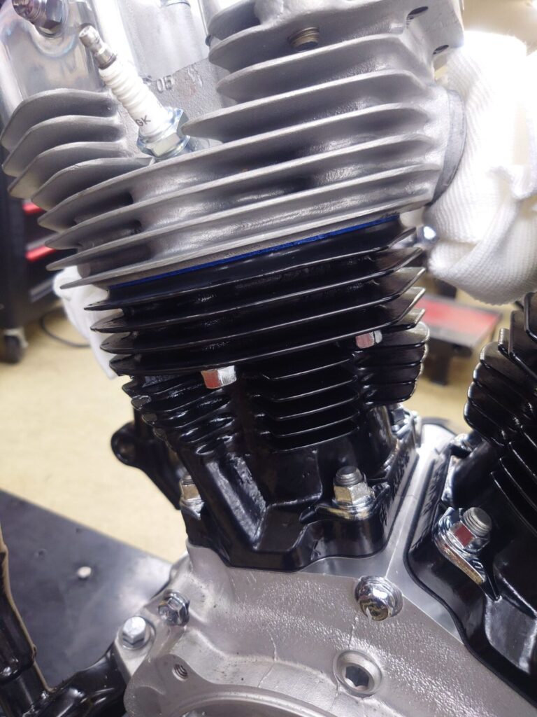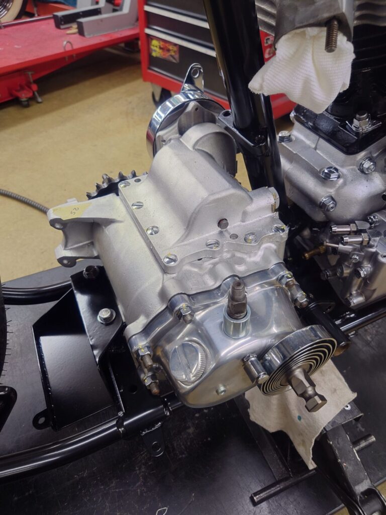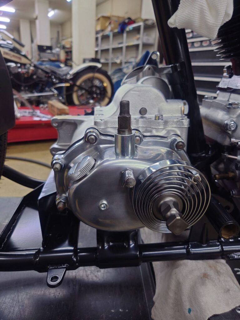 エンジンとミッションは完全に分解し、内部はもちろん外観に至るまで徹底的に手を入れました。ケース類は塗装や旧メッキをすべて剥離し、ウエットブラストで丁寧に仕上げ直し。アルミカバー類はバフ磨きで艶やかに。鉄部品は半艶ブラックのパウダーコートで引き締め、ボルトやナットに至るまで可能な限り新品交換や再メッキ加工を施しています。もしかすると、新車だった頃よりも整ったコンディションかもしれません。ここまで仕上げるのは決して簡単な作業ではありませんが、この輝きを目にするとその苦労も吹き飛びます。