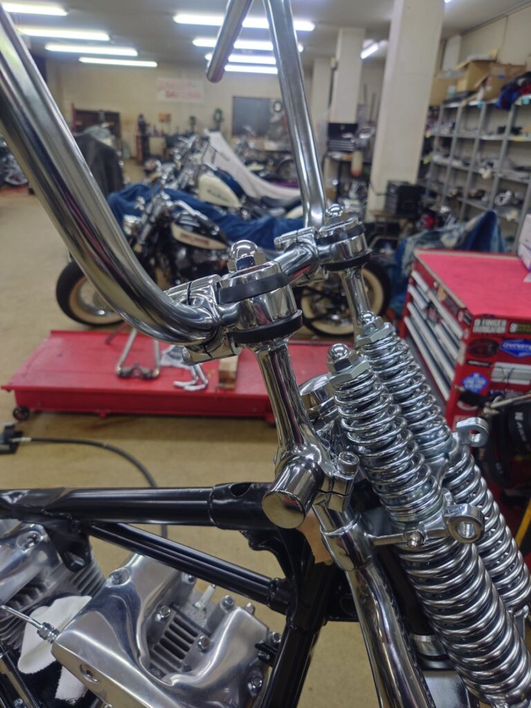 ハンドルは大きめのエイプハンガースタイル。ライザーはドッグボーンタイプを選びました。しかもラバーマウント仕様ですので、走行中の振動をラバーが吸収してくれて、手に伝わるビリビリ感を和らげてくれます。幅広めのエイプは、取り回しの時にも力が入りやすく、実は扱いやすいんです。見た目だけではなく、ちゃんと意味のあるサイズ感で組んでいます。それぞれのパーツの組み合わせが、まさに“ザ・70年代”。でも、ただ雰囲気だけを追っているわけではありません。あくまでもテーマは「乗りやすいカスタムバイク」。見た目はしっかりチョッパー。でも乗ると意外と優しい。そんな一台を目指して、丁寧に組み上げております。