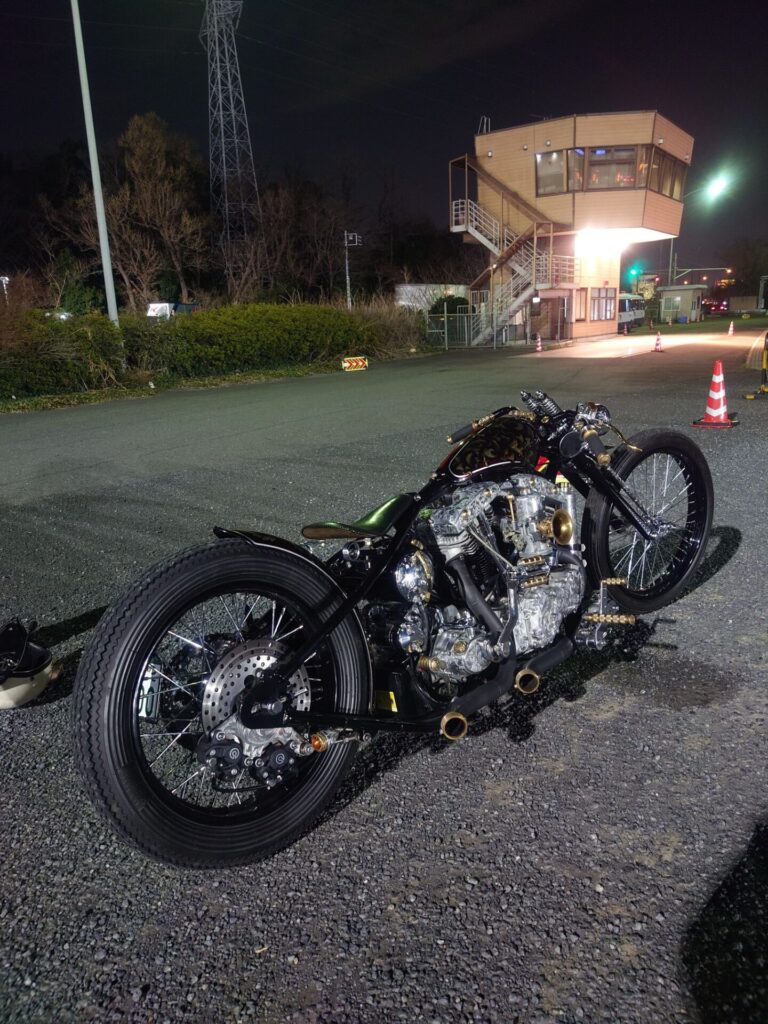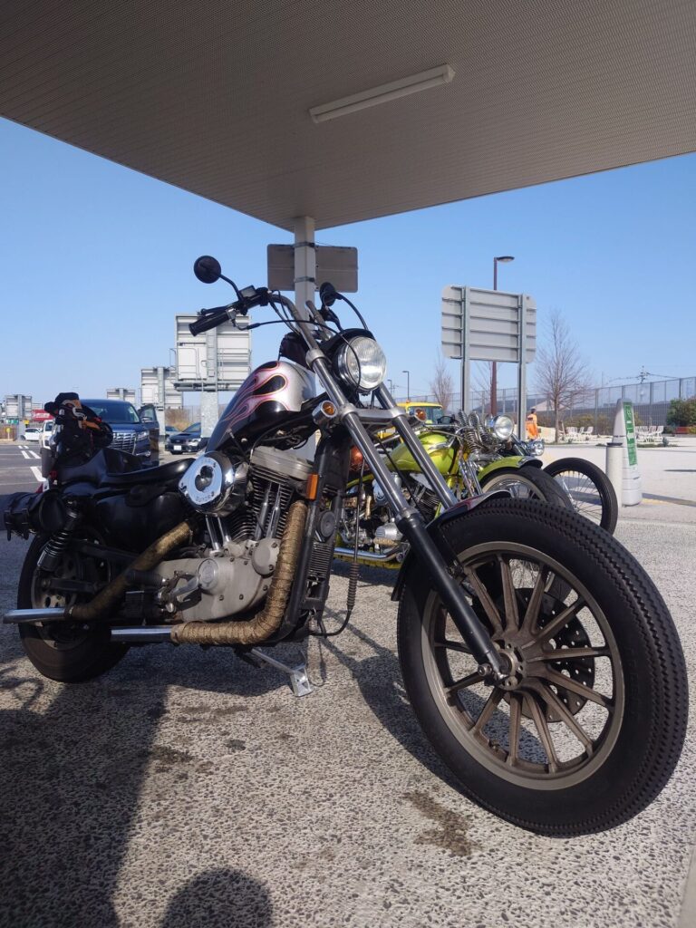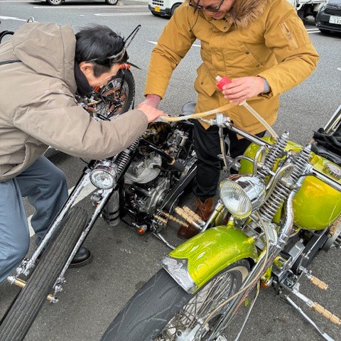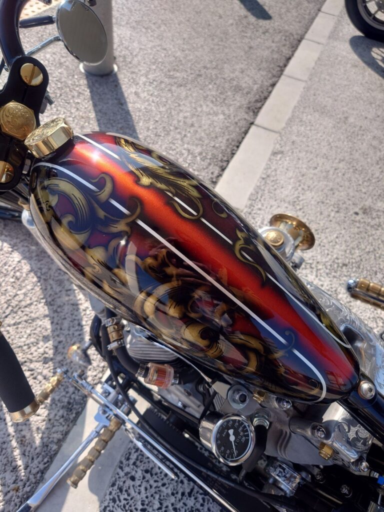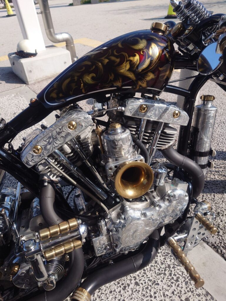 さらに驚いたのが、長年のパートナーであるGクラシックの赤坂さんが偶然同じサービスエリアに立ち寄っていたこと。赤坂さんが手掛けたペイントと彫金が施されたスペシャルな一台に乗っており、思わぬ再会で話も弾みました。