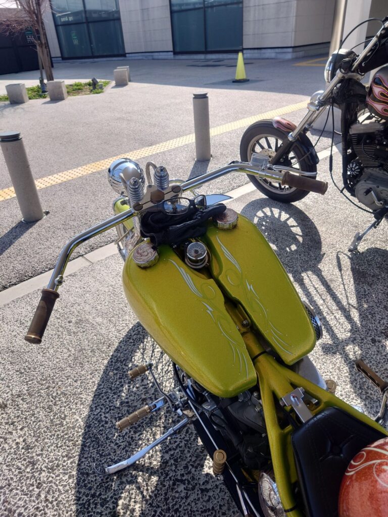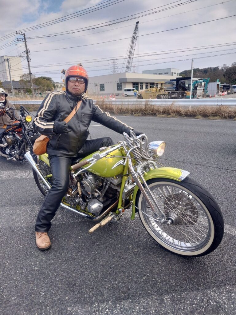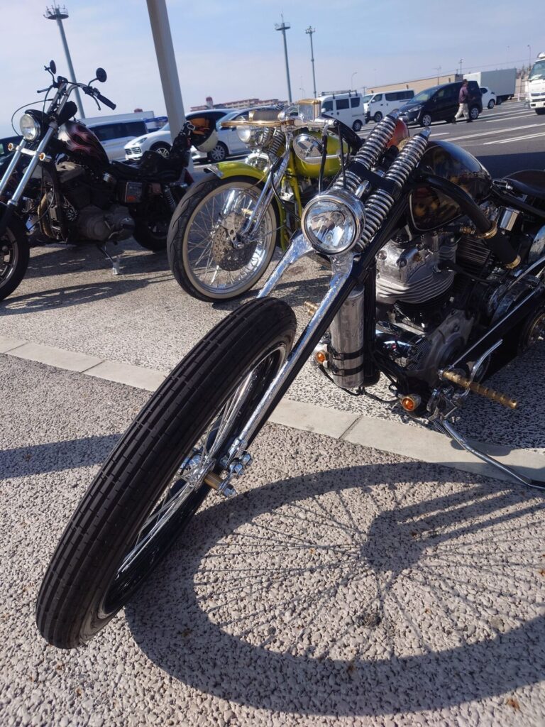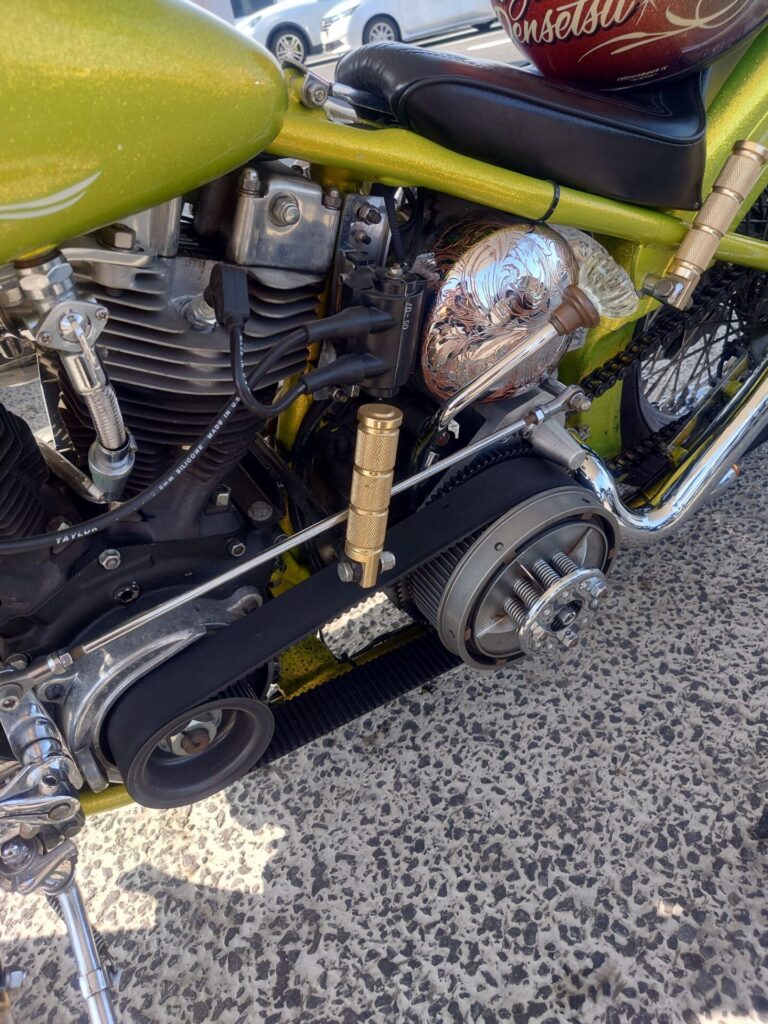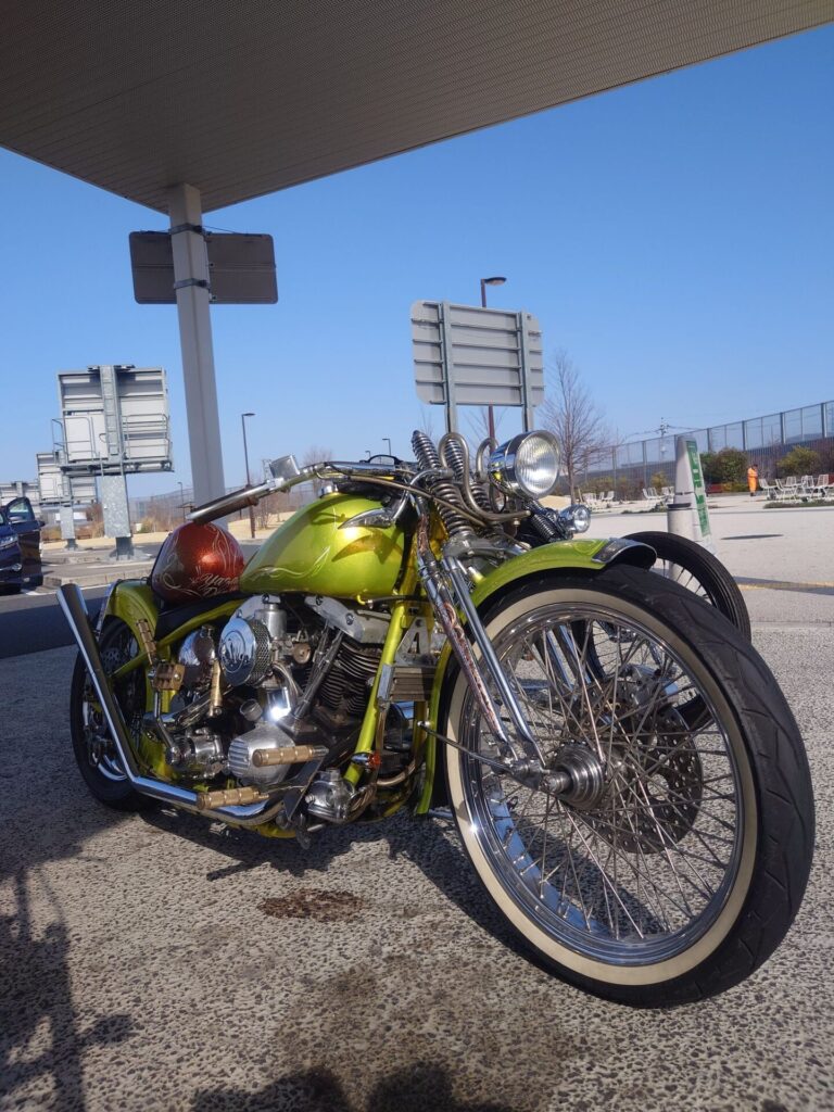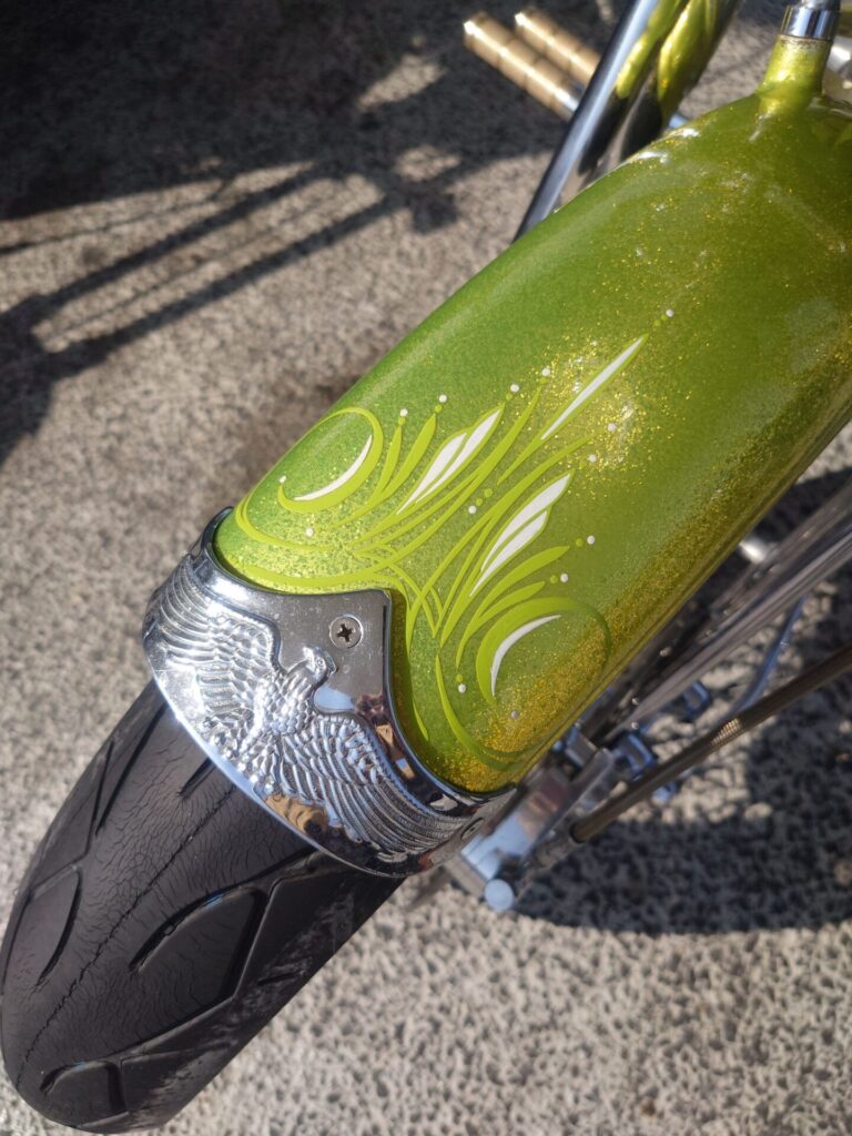 続いては、太陽の下で眩しく輝くライムグリーンのショベルヘッド。約15年前にフルオーダーで製作させていただいた一台です。74スプリンガーに、フロント21インチ・リア18インチのホイール、5ガロンの分割タンク、ワイドなビーチバー、ラペラ製シート。最近マフラーを作り直し、左右出しのアップスイープ・メガホンスタイルへと進化。歯切れの良いサウンドで、正直、私のバイクの音は完全にかき消されておりました(笑)