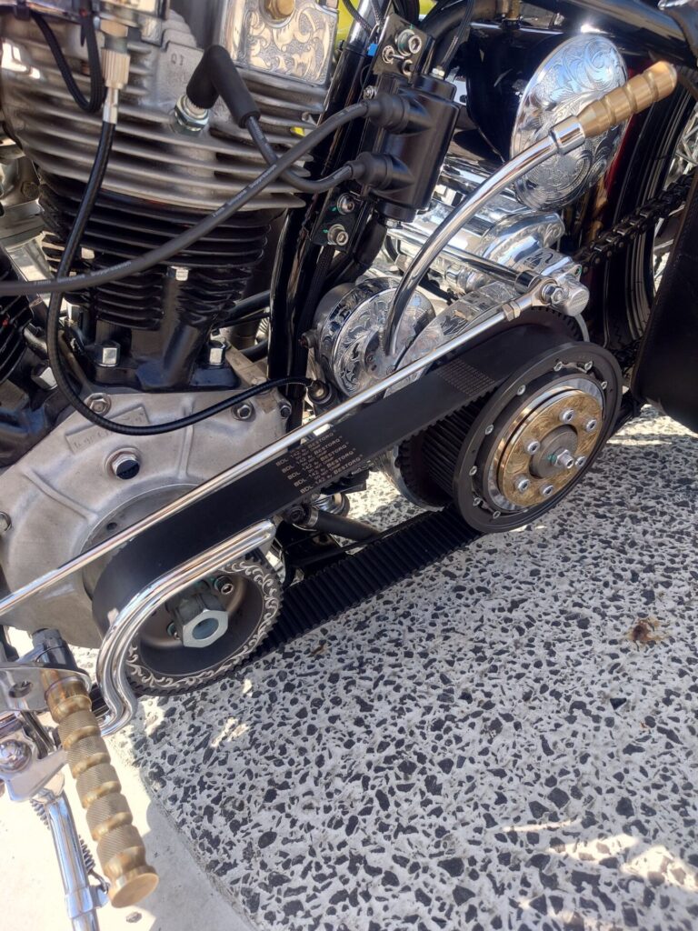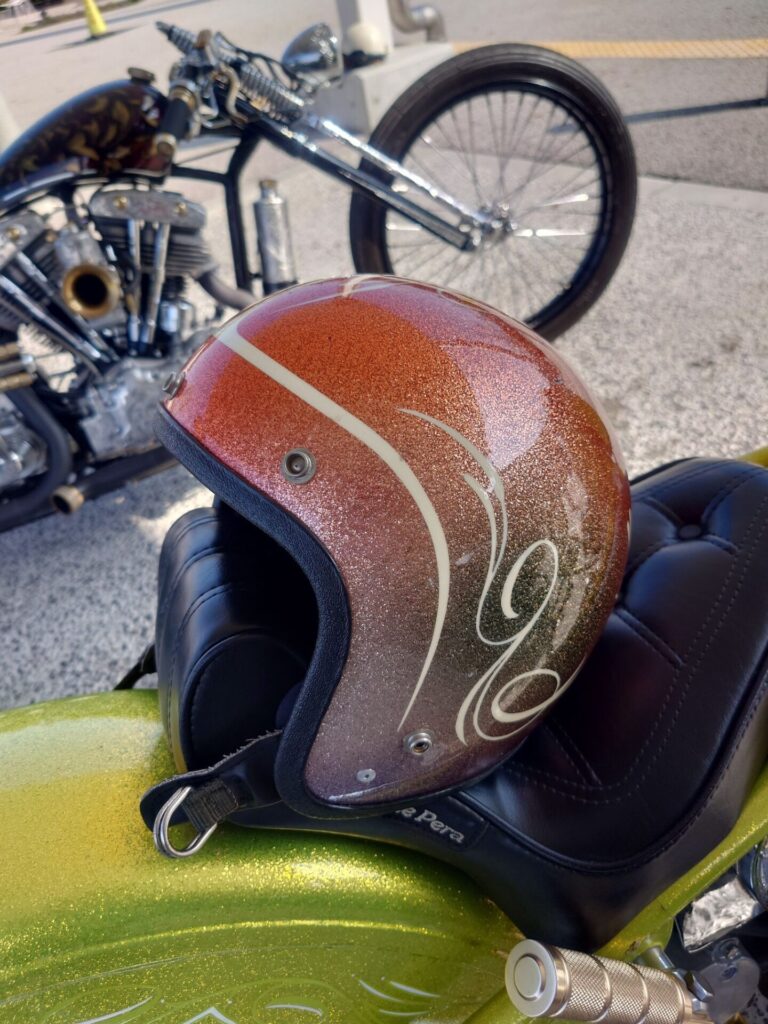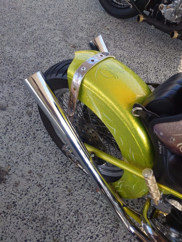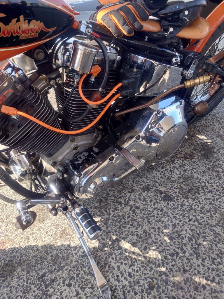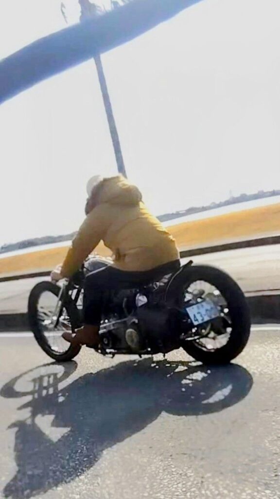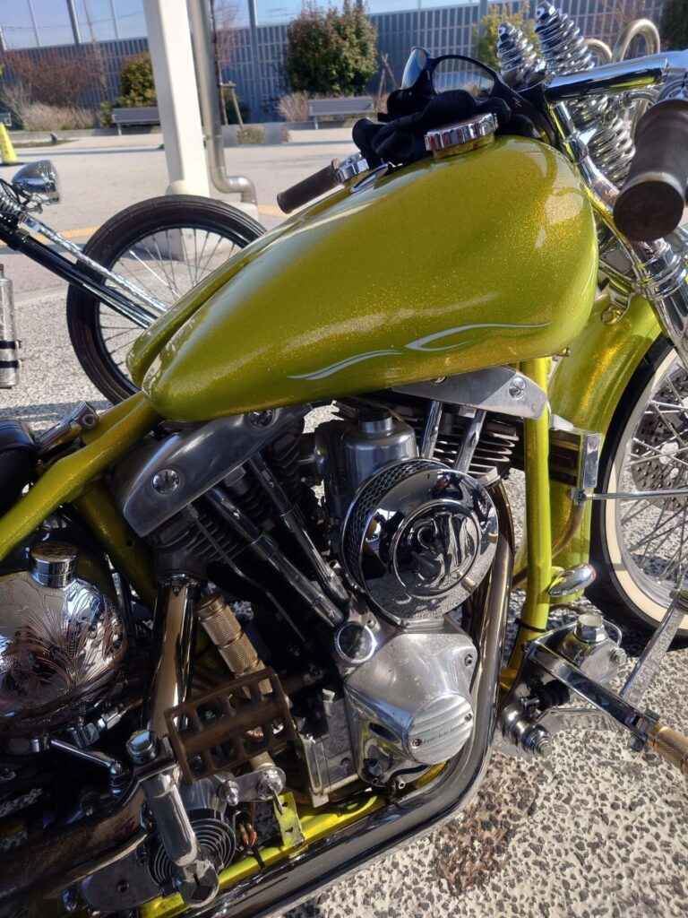 続いては、太陽の下で眩しく輝くライムグリーンのショベルヘッド。約15年前にフルオーダーで製作させていただいた一台です。74スプリンガーに、フロント21インチ・リア18インチのホイール、5ガロンの分割タンク、ワイドなビーチバー、ラペラ製シート。最近マフラーを作り直し、左右出しのアップスイープ・メガホンスタイルへと進化。歯切れの良いサウンドで、正直、私のバイクの音は完全にかき消されておりました(笑)