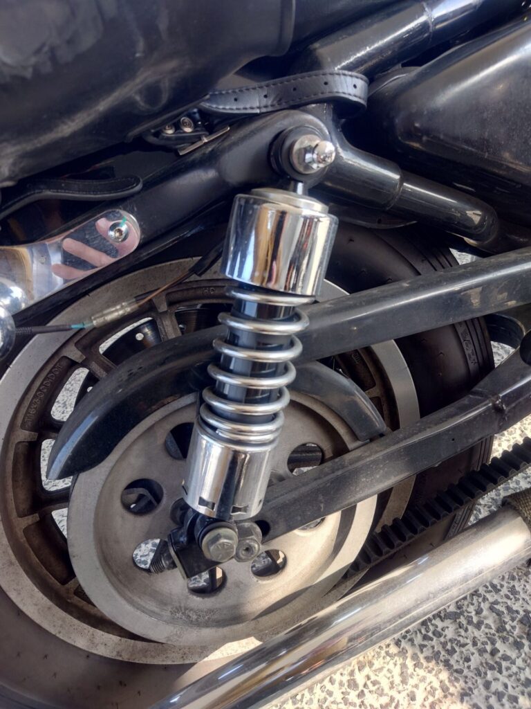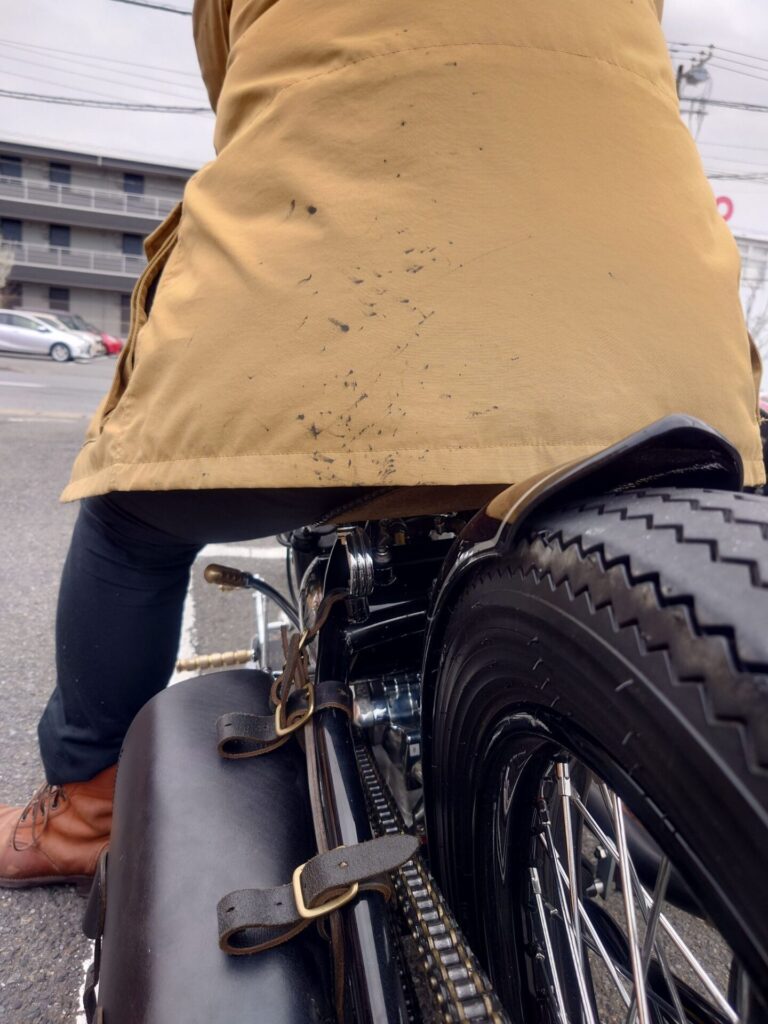 画像に写っている黄色のジャケットに付いている黒い点々。これは何かと言いますと、ドライブチェーンから跳ね上がってきたオイルです。ショベルやパン、ナックルなどの4速ミッション車両では、スプロケット周辺からのオイル漏れが起こりやすく、このように衣類へ飛散してしまうことがよくあります。もちろんオイル漏れ修理は可能ではありますが、気づいた時にはすでにこうなっている…というのが現実です。そのため、チェーンカバーを装着しておくことで、オイルの飛散をある程度抑えることができます。こういった理由から、旧車乗りの方に黒い服装が多いのも、なんとなくご理解いただけるのではないでしょうか。