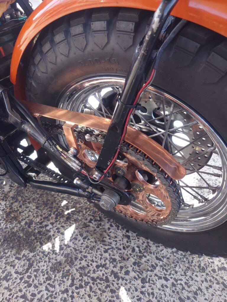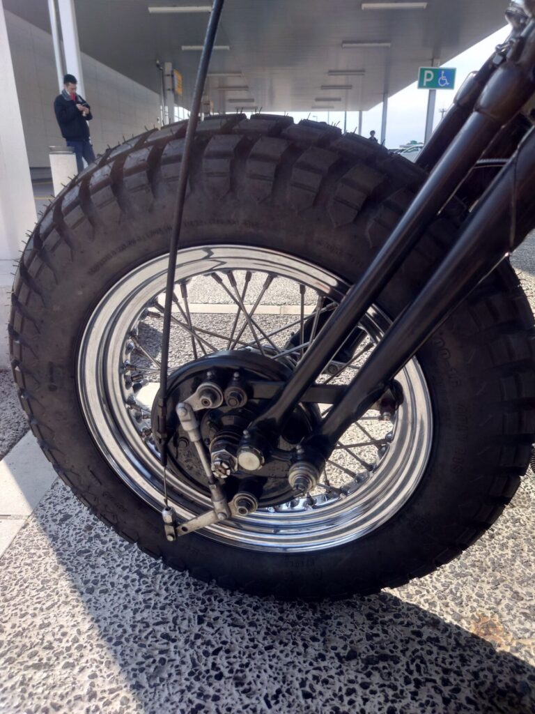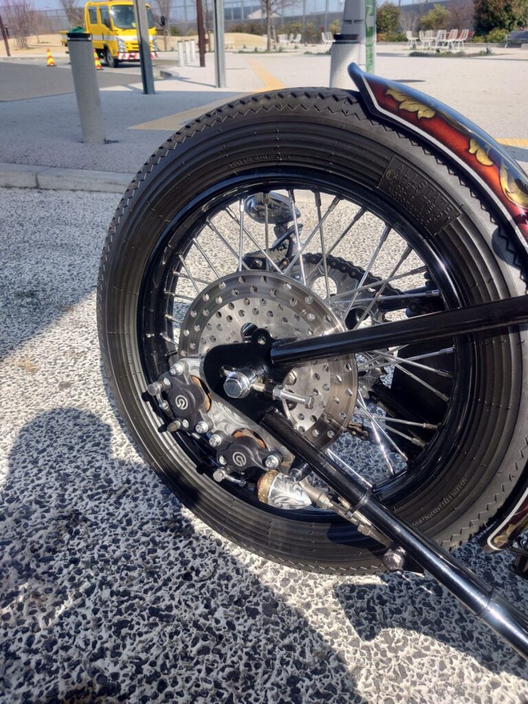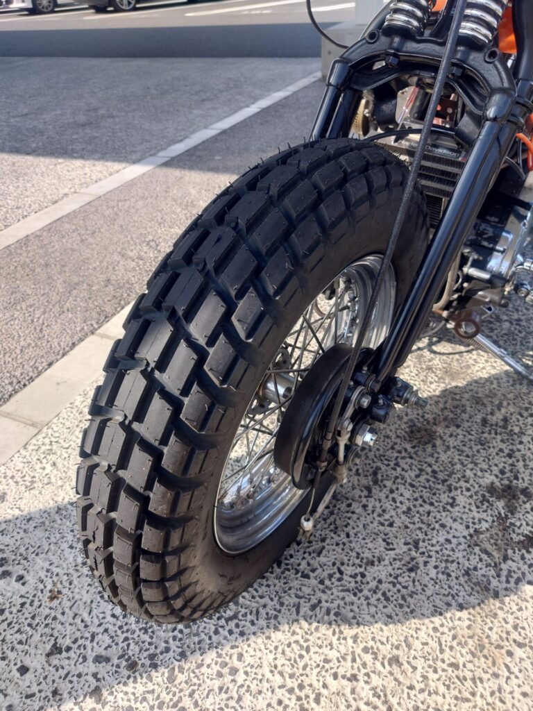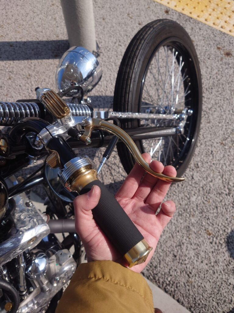 そして最後に、私オオガキの車両。全体にエングレービングを施した、当店のプレミアムモデルです。細さを徹底的に追求し、フロント21インチ・リア18インチ、ナローなスプリンガーフォークを採用。フロントブレーキはあえて装着せず、リアブレーキのみで操作するスタイルですが、右手レバーと右足ペダルの両方で操作可能な仕様にしています。見た目のインパクトと乗り味、どちらも強烈な一台です。
