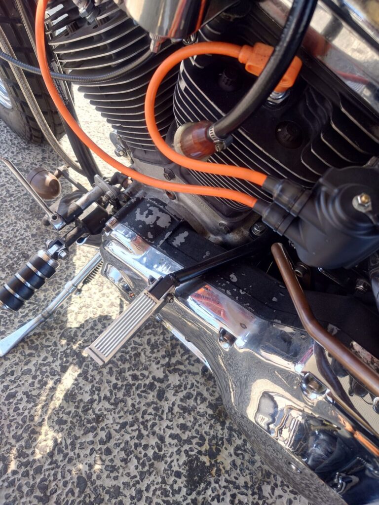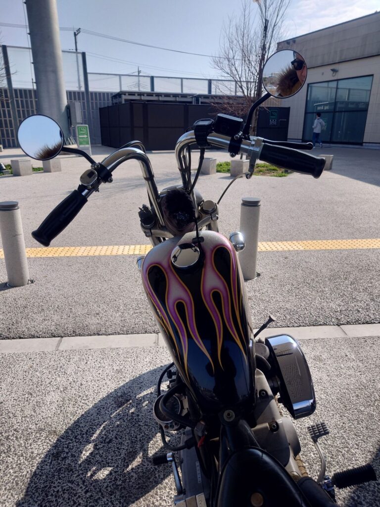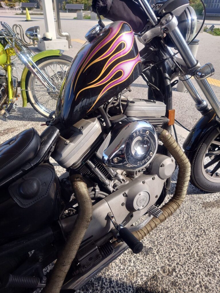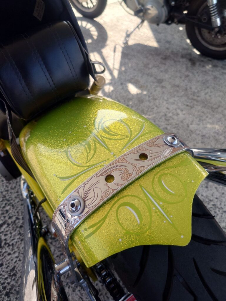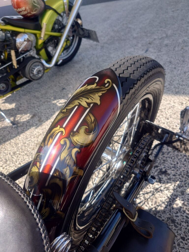そしてもう一台は、カチ上げスタイルのロングチョッパー。エボスポーツスターをベースに、フロントフォークはロングインナーで大きくリフトアップ。リアは極限までローダウンし、三角形のシルエットを追求しています。一時はタイヤがフェンダーに干渉するトラブルもありましたが、外径の小さいヴィンテージタイプのタイヤへ変更し、機能面とスタイルを両立。フレアーペイントも相まって、まさに“ザ・チョッパー”といった一台に仕上がっています。