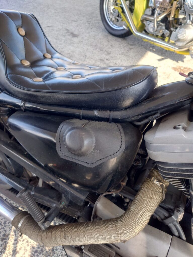 まずは今回のリーダー的存在の一台。エボエンジン搭載のソフテイルをベースにしたカスタムで、フロントには74スプリンガーフォークを装着。前後16インチホイールにピーナッツタンク、サドルシート、フラットフェンダー、シーシーバー、そしてアップスイープマフラーにヴィンテージのトランペットサイレンサー。さらにノンロッカークラッチにジョッキーシフト、かなりナローなハンドルと、扱いには少し注意が必要な仕様です。約25年ほど乗り続けている車両で、オオガキが入社した時からのお付き合いで、長年一緒に走る仲間でもあります。